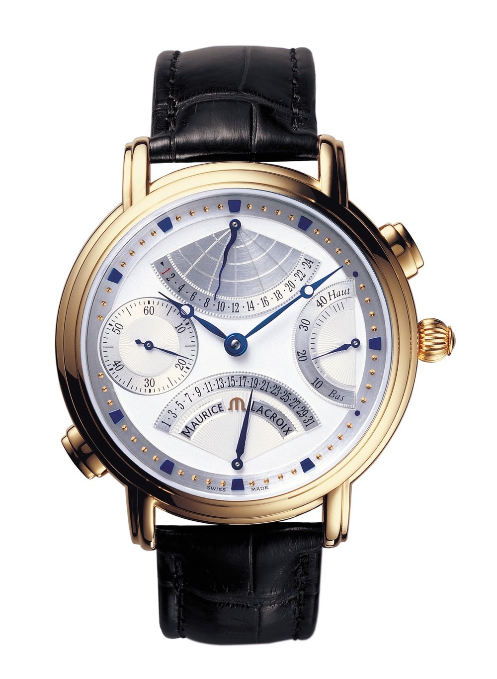 A big première in the Masterpiece Collection: Maurice Lacroix has come up with a precious timepiece equipped with two retrograde display modules developed entirely by the brand’s own workshops. The mechanical movement, visible through the transparent back, boasts high-quality finishes. This exceptional model marks the start of a new era for this young watchmaking brand.