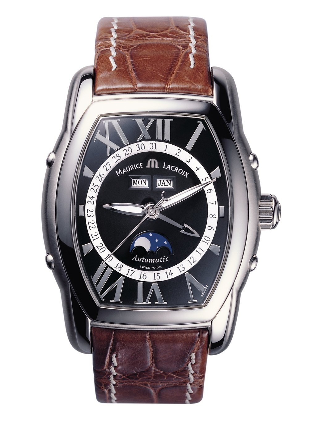 Balanced proportions, a slightly waisted case-middle, curved bracelet attachments: Maurice Lacroix is reinventing the barrel case in a creation which combines elegance with ergonomics. The highly original dial displays a calendar complete with a hand showing the date and a window for the moon phase. This timepiece has been developed and manufactured in its entirety in the brand’s workshops.