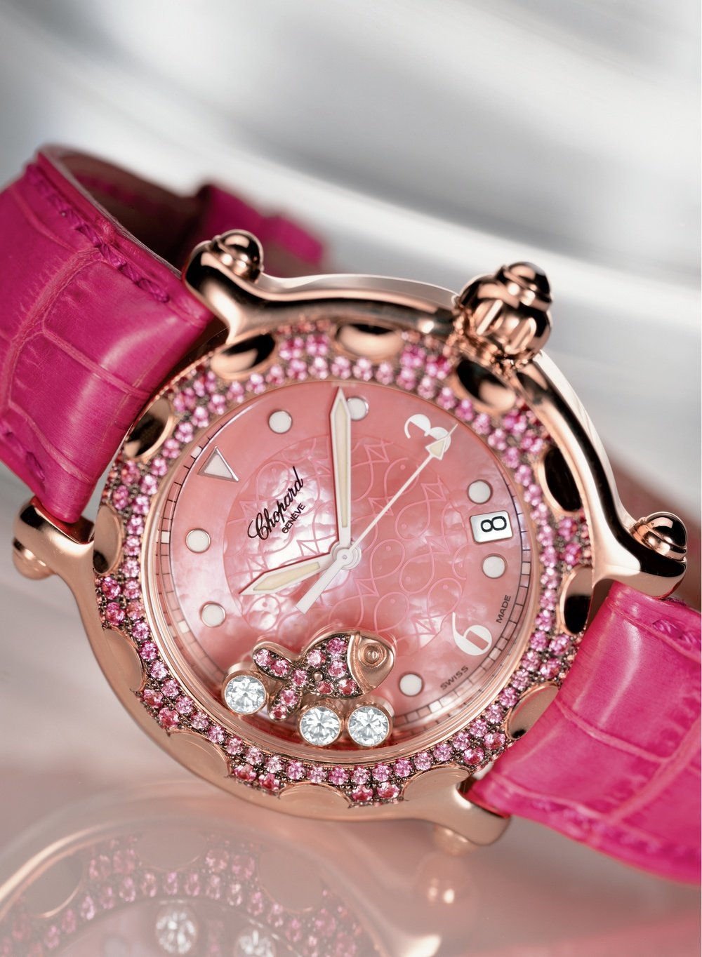 “Happy Fish Pink” large-sized watch in 18-carat rose gold, in the “Happy Sport” collection, pink mother-of-pearl dial with mobile fish set with pink sapphires and three mobile diamonds, bezel set with pink sapphires, quartz movement, water-resistant to 30 metres. Pink crocodile leather strap with gold ardillon buckle. Available exclusively from Chopard boutiques.