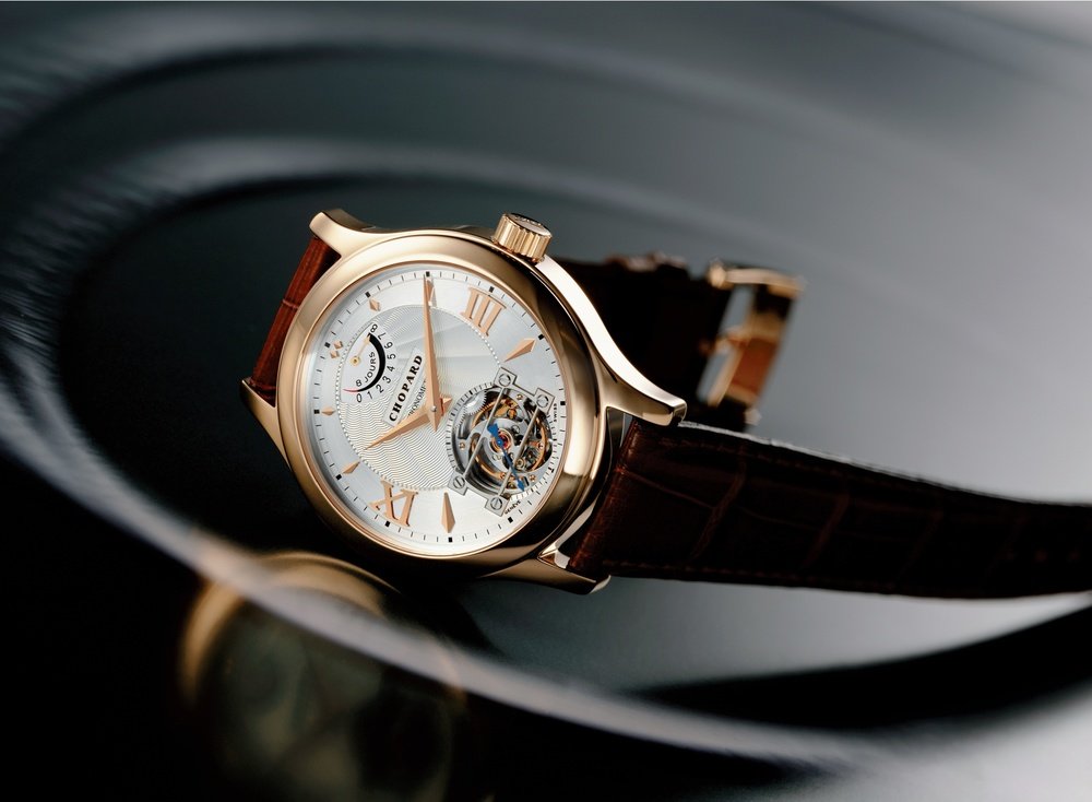 First “L.U.C” watch equipped with a “L.U.C. 1.02” calibre with Tourbillon. The mechanical hand-wound movement with four barrels (L.U.C Quattro technology) ensures a power-reserve of 9 days. Adjustment of daily rating is ensured by the rotation of small inertia-blocks on a “Variner” type balance, for which a patent is pending. The precision of this model is guaranteed by the COSC chronometer certification, while the “Poinçon de Genève” quality hallmark testifies to the high level of finish of this exceptional creation. The hour and minute hands as well as the power-reserve indication are in gold. The “one minute” tourbillon at 6 o’clock carries a blued steel seconds hand while the power-reserve is indicated over the arc of a circle positioned at 12 o’clock. The watch comes in two limited numbered series: 100 in 18ct rose gold and 100 in 950 platinum.