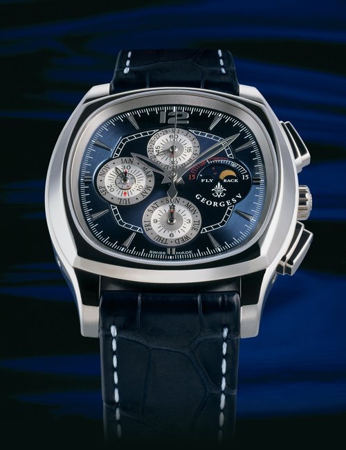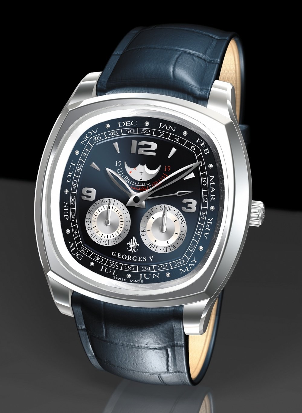 The young, exclusive Georges V brand is offering a highly elegant model from its “sporting-chic” V line, equipped with an annual calendar. This complicated mechanism displays the precise date automatically, making allowance for the months with 30 and 31 days. And another useful function: a hand mounted on the centre of the dial to indicate the number of the week.