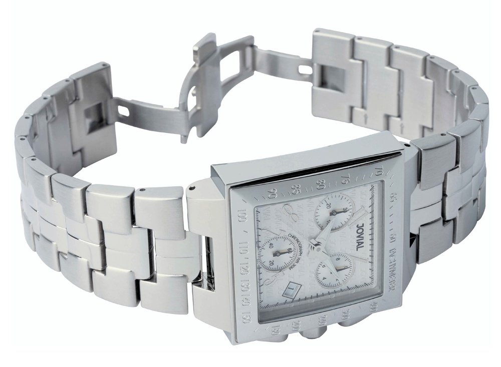 An elegant dial in white mother-of-pearl mitigates the powerful architecture of the square case and its attachments on this model. Paying meticulous attention to detail, Jovial has come up with a chronograph in a sporting, chic style. The asymmetric arrangement of the numerals on the dial, the fine contrast between the satin-finish and matt surfaces on the bracelet and the slender profile of the push-buttons ensure that this functional watch is a delight to look at too.