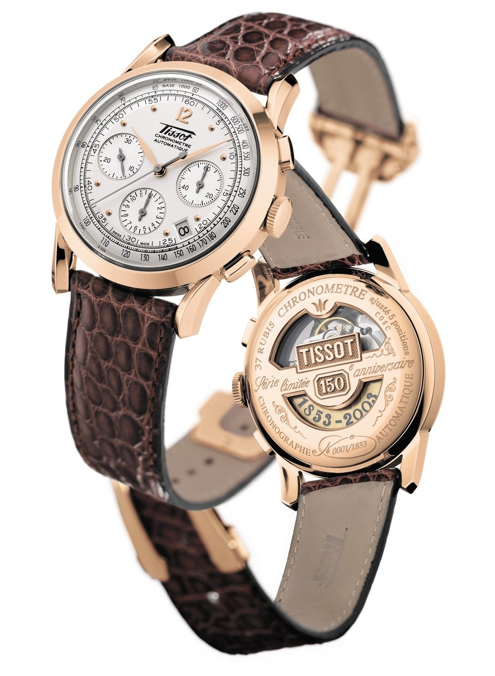 Tissot is celebrating its 150th anniversary with the launch of several numbered, limited editions of an automatic chronograph, inspired by one of its most prestigious watches dating from 1946. The back, engraved in 19th-century style, incorporates two openings to reveal the gilt oscillating weight marked with the dates 1853 and 2003. An exceptional watch for an exceptional occasion.