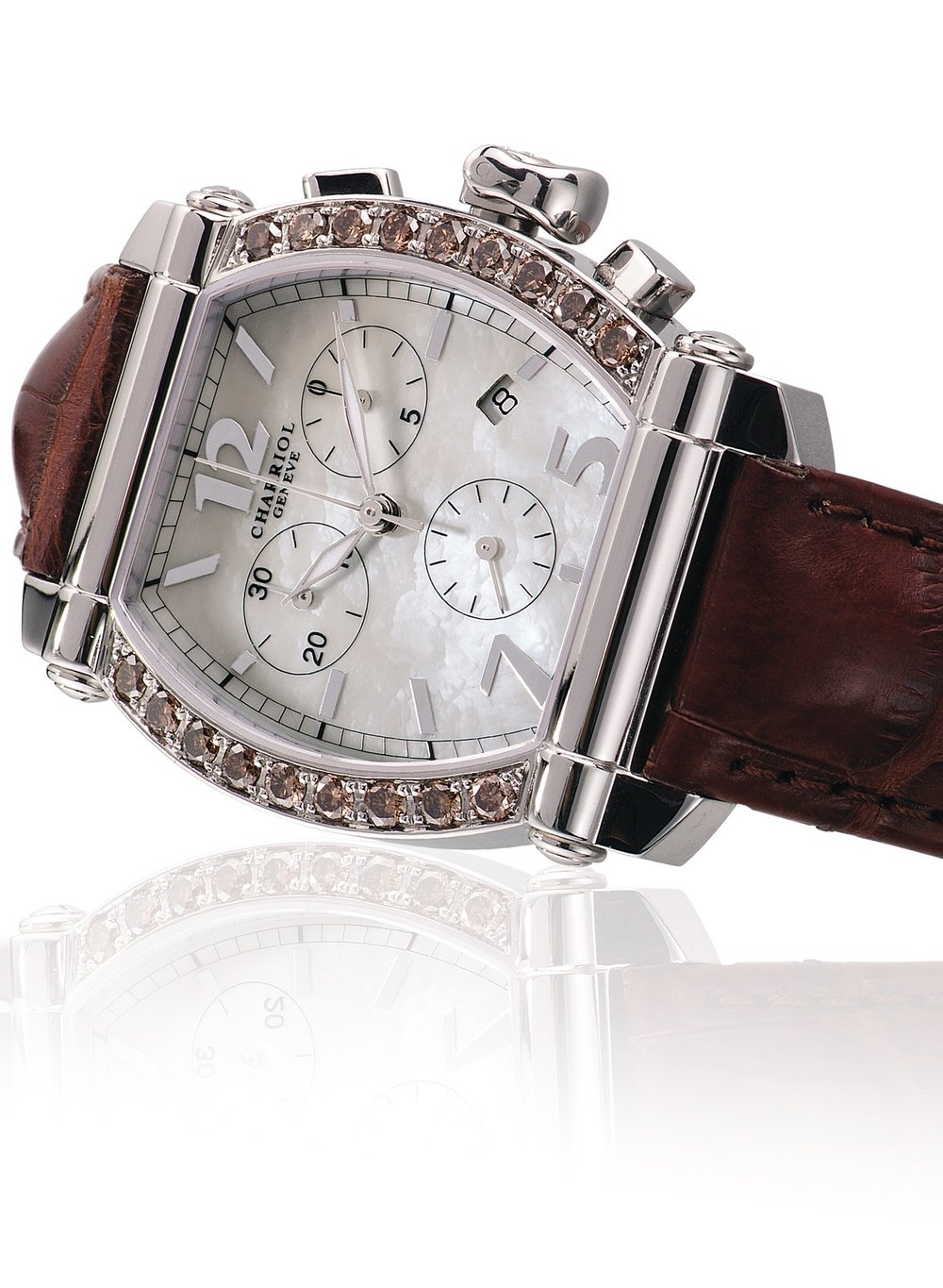 Recognisable by its slightly curved, fashioned barrel case, its crown incorporating a shackle and its decorated back, this chronograph marks a highly feminine version of the Colvmbvs family. The sober and elegant display of its chrono functions makes it easy to read. The sophisticated sparkle of the cognac diamonds against the white mother-of-pearl lends this watch more than just a touch of luxury.