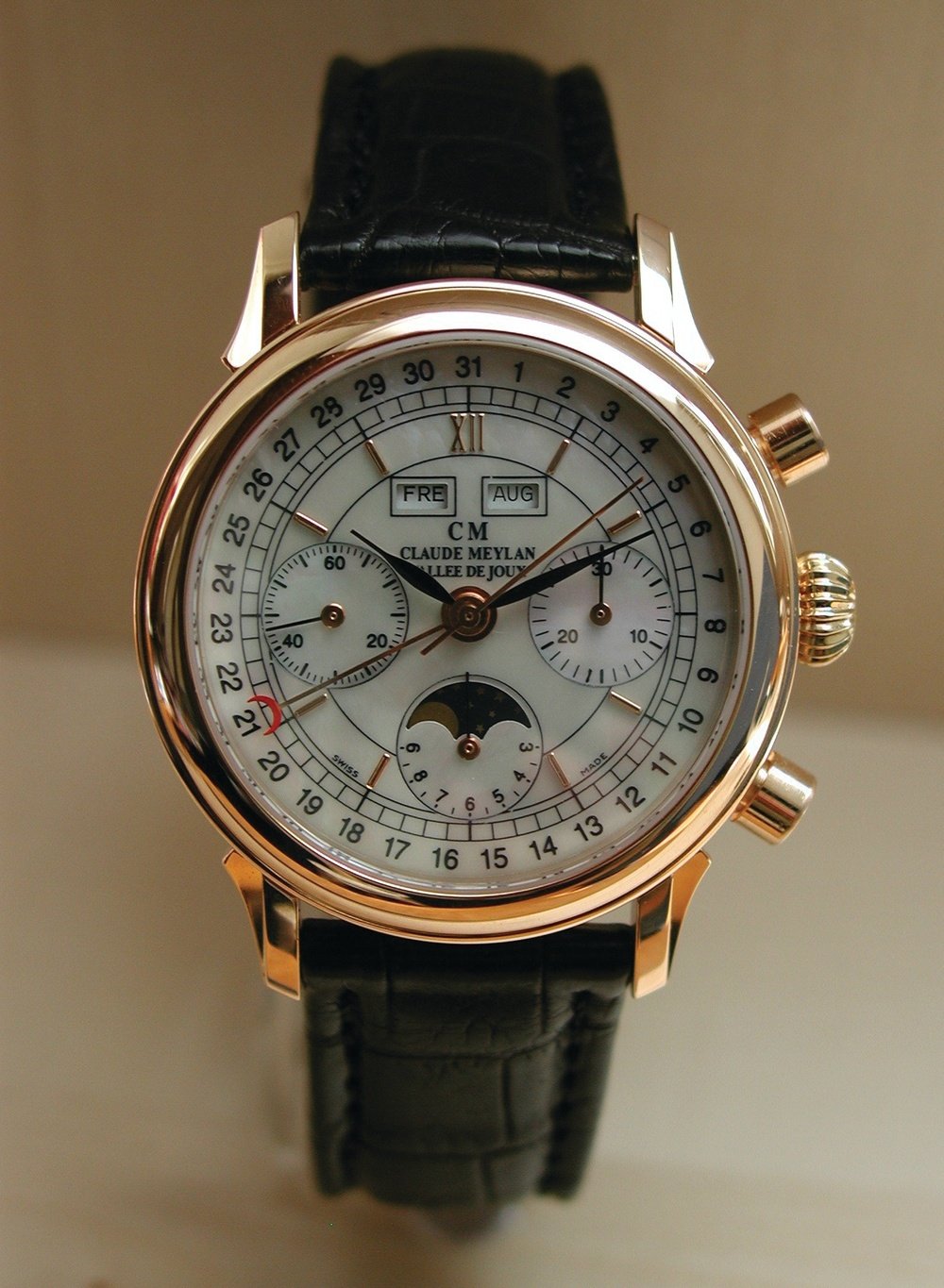 This precious chronograph with a date bears the signature “Claude Meylan, Vallée de Joux” and has given a new lease of life to an authentic 1970s calibre, decorated according to the rules of the art.