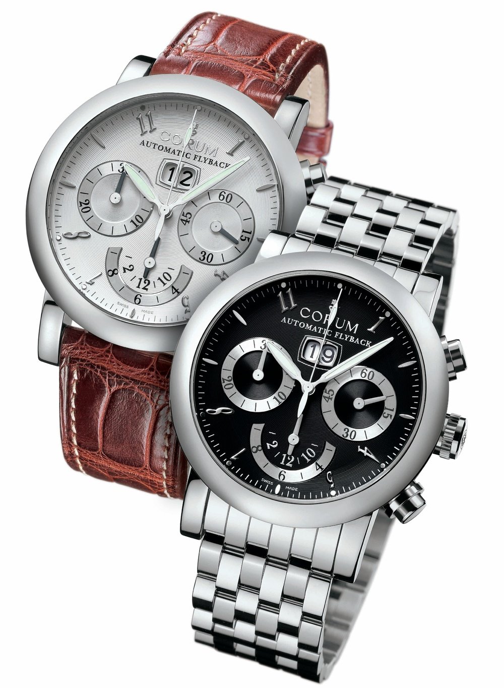 Incorporating three useful complications - a chronograph, flyback function and big date - this contemporary-design timepiece constitutes both a technically refined and elegant model, testifying to the sophisticated know-how of the Corum brand.