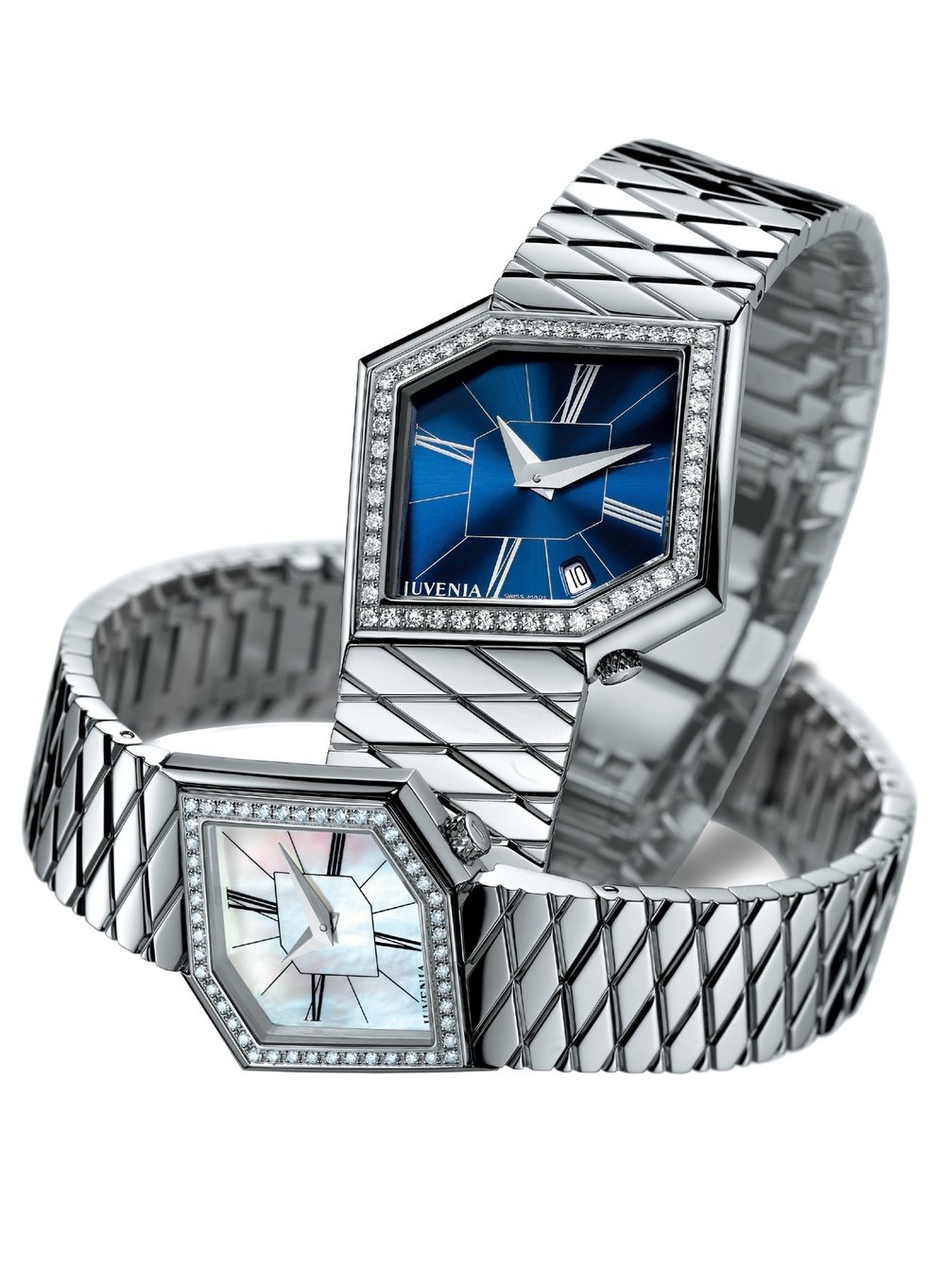 A bold geometry for this model in polished steel: the diamond border adorning six sides of the curved case accentuates the asymmetric design still further.