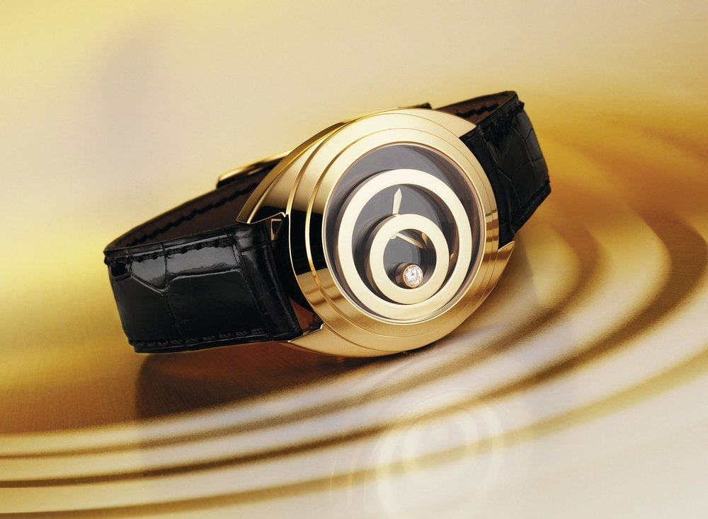 Stylised and jovial, this watch marks a new interpretation of the “Happy Diamonds” spirit; the concentric circles in yellow gold adorning the dial enclose a delightful mobile diamond.