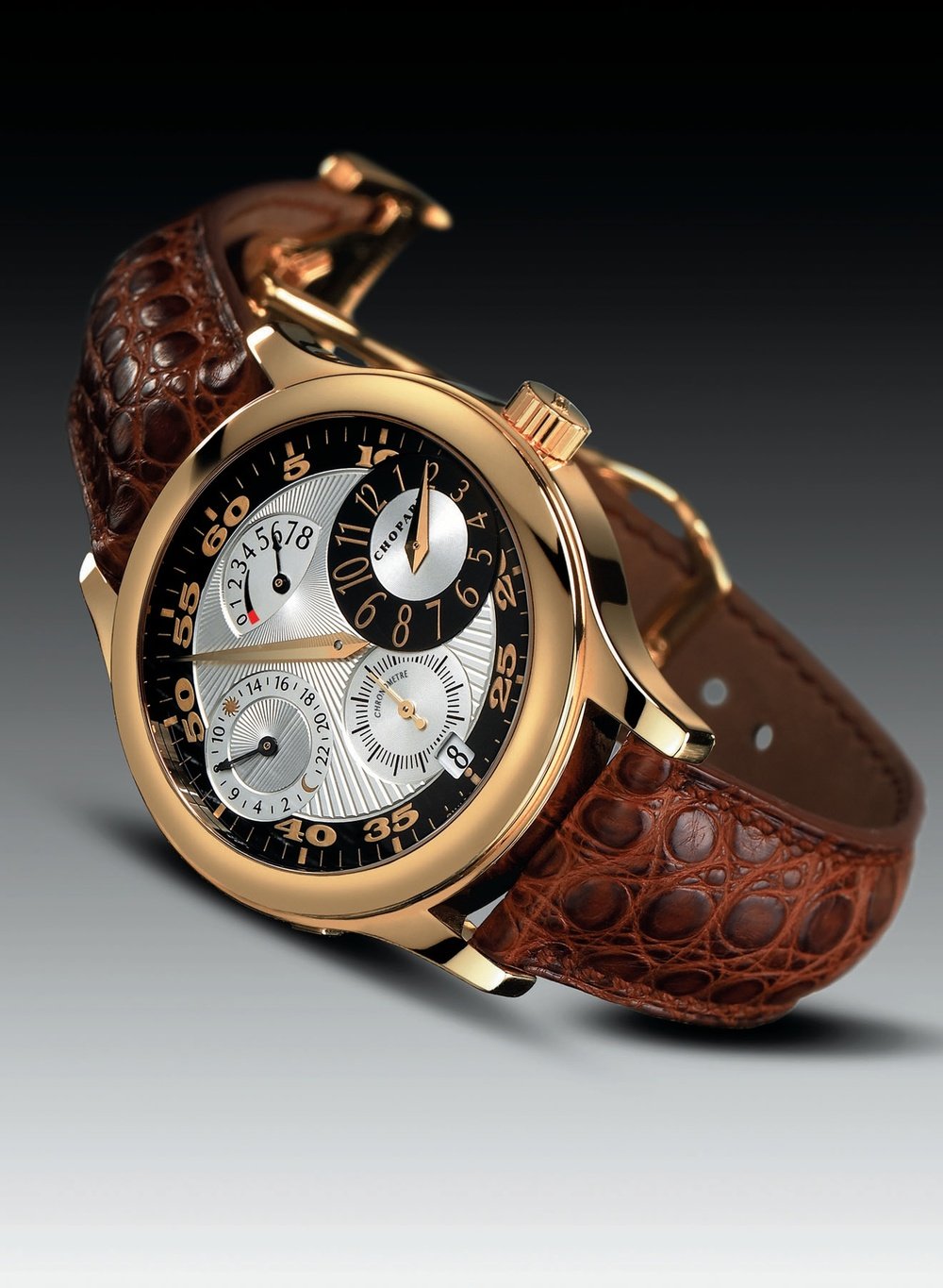 With its nine-day power reserve and adjustable time zone, this watch marries a remarkable technical performance with one of the most successful regulator-type time displays. The dial, with its particularly meticulous workmanship, is pleasingly symmetrical.