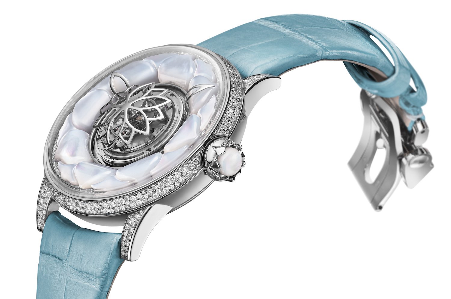 Drawing on their shared passion for gems, the trio gave birth to an initial collection with floral motifs called Dahlia. In terms of technical design, Beauregard called upon the services of Telos in La Chaux-de-Fonds to create the flying tourbillon that occupies the centre of the dial of this collection.