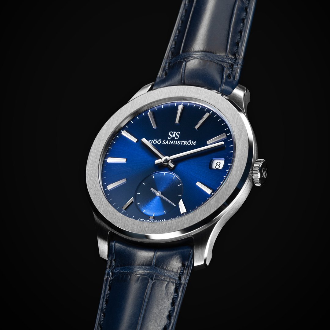- The Sjöö Sandström Royal Capital with a blue sunbrushed dial and snailed subdial.