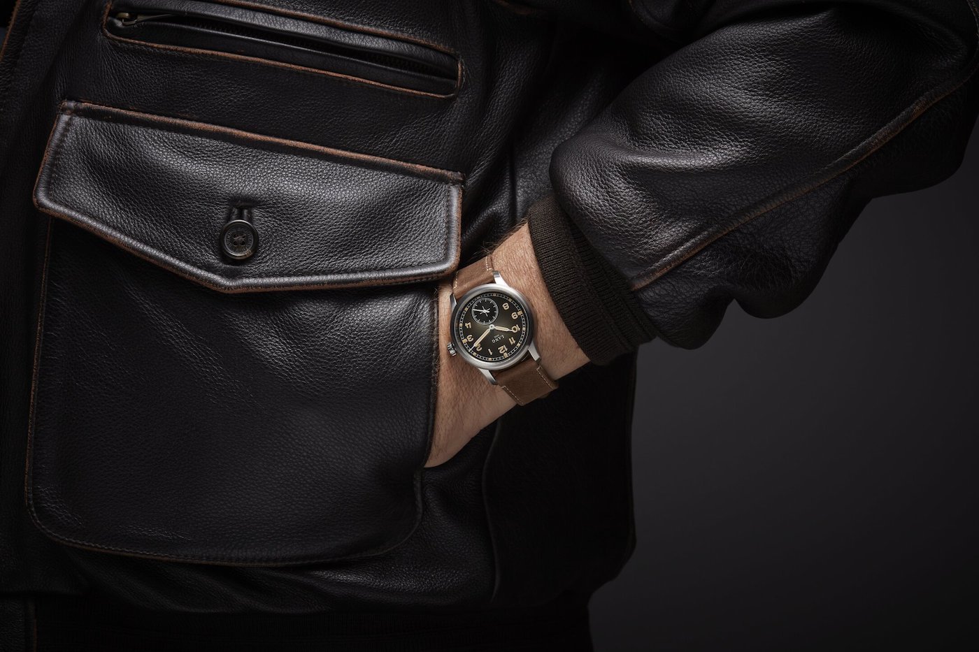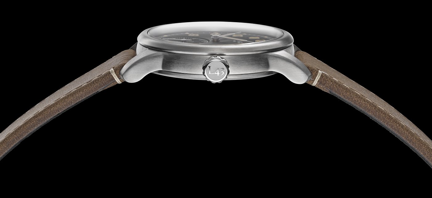 The Lang 1943 launch series is inspired by military field watches, specifically the Dirty Dozen, the 12 legendary watches commissioned by the British Ministry of Defence in the 1940s. Manufactured by Buren, Cyma, Eterna, Grana, Jaeger-LeCoultre, Lemania, Longines, IWC, Omega, Record, Timor and Vertex, these watches had to meet strict specifications including water-resistance, luminosity, chronometric regulation and a robust case. The dial had to be black with Arabic numerals.