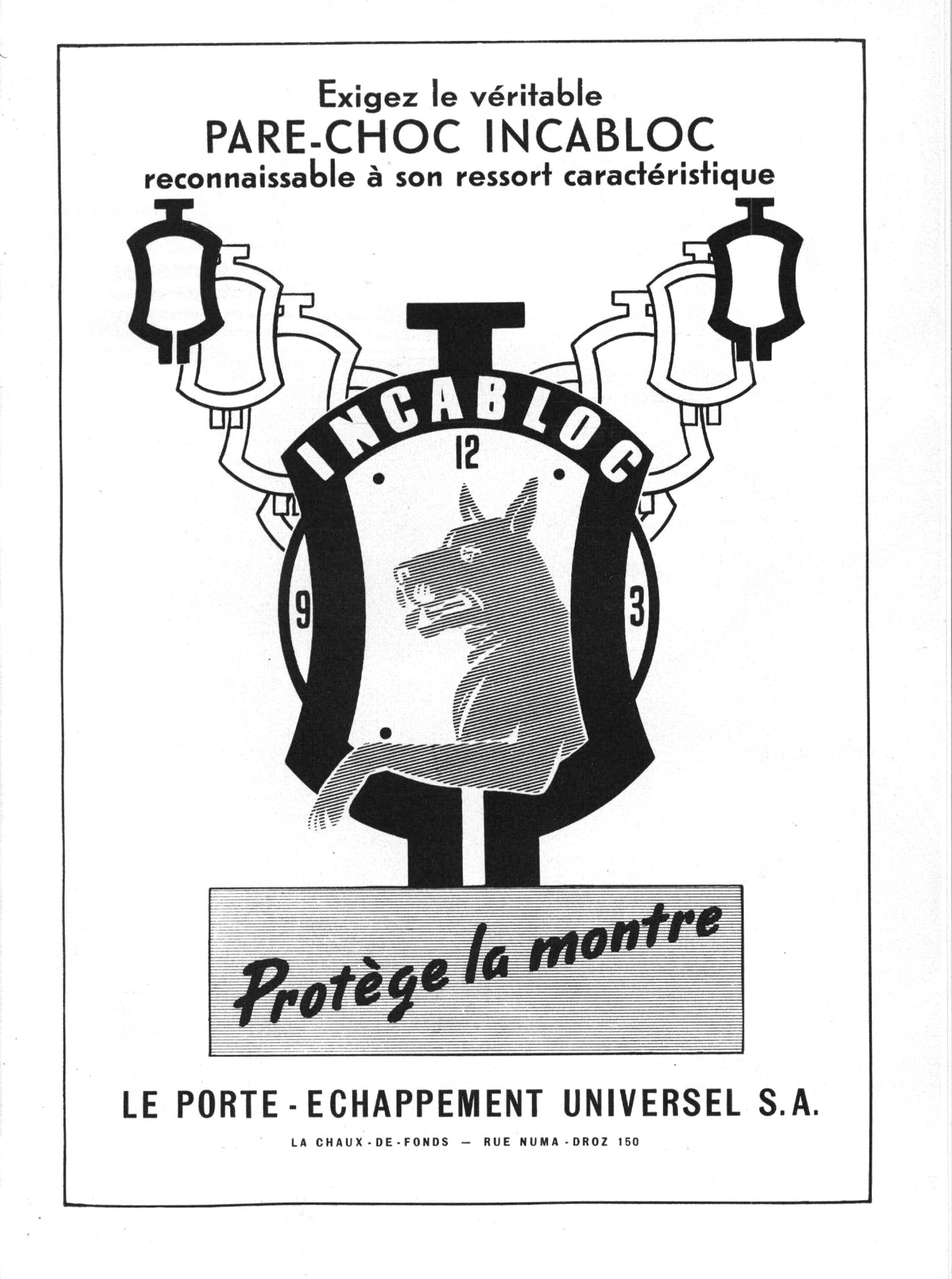 At the same time, Fritz Marti was developing an “incassable” (unbreakable) balance mount, with conical jewels capped with a movable block jewel under a metal clip. Seeing the commercial potential, the invention was patented by Marti in 1931 and named Incabloc in 1933. Election was rocked by a financial scandal at that time, so Marti set up a new firm with his former student Henri Quaile to produce standard escapement components, including his patented lyre-shaped Incabloc shock absorber. Georges Braunschweig officially joined his friend at Le Porte-échappement Universel SA once his name was cleared in 1934.