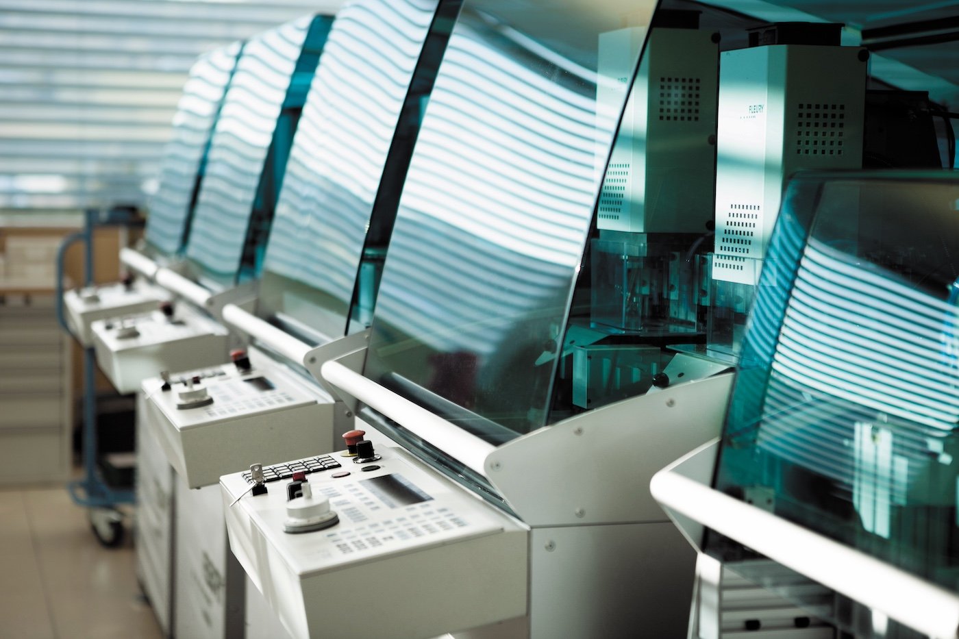 Brass blanks are loaded into state-of-the-art modular linear transfer machines, built by Fleury SA in Biel. Some fifty machines sand, microblast, turn and cut the plates. Quality is controlled to one thousandth of a millimetre by automated probes and binocular magnifiers.