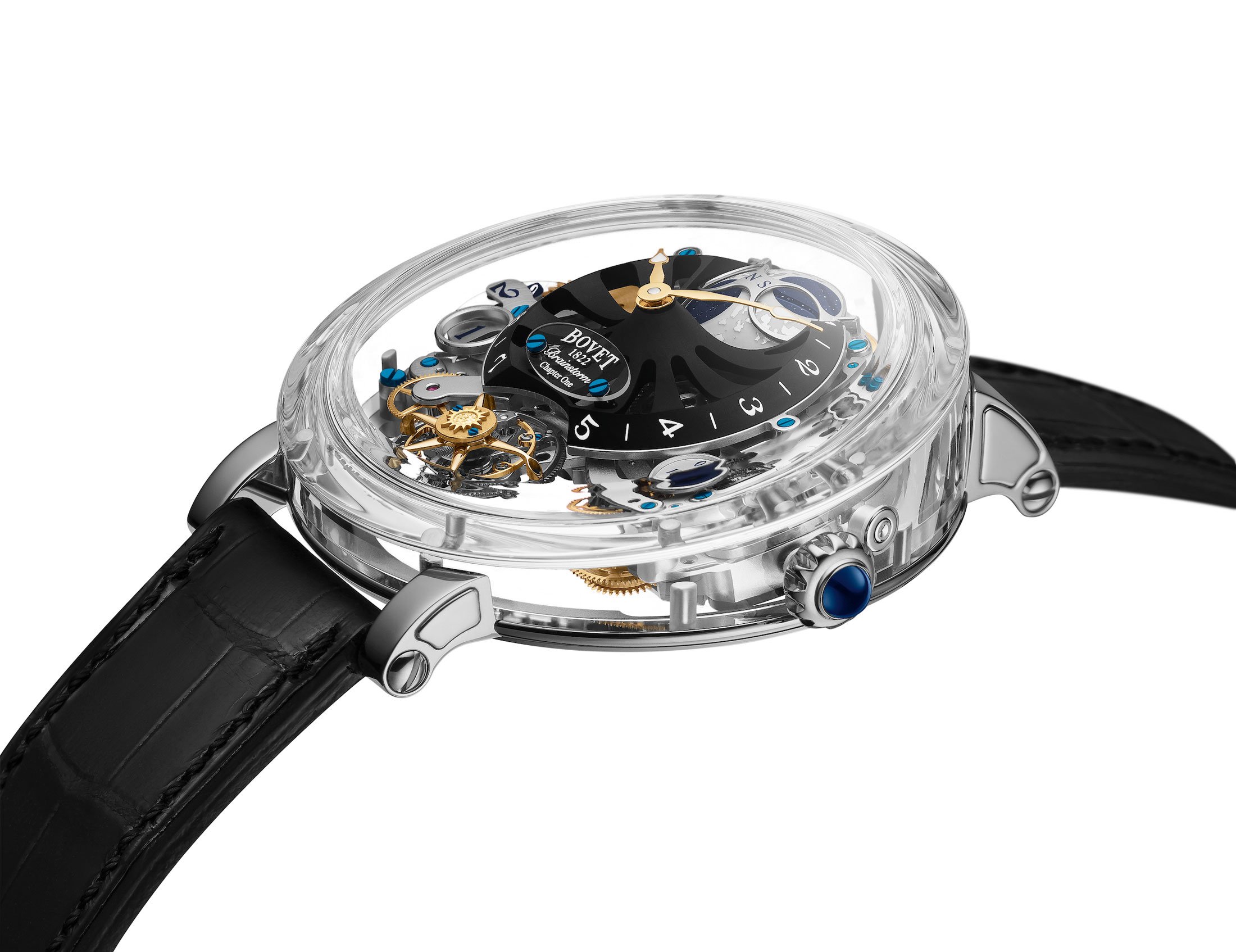 This characteristic is used to particular advantage in the new Récital 26 Brainstorm® Chapter One, with its all-transparent, sapphire, inclined case – a bold and complex technical feat given the asymmetric profile of the middle, which forms a single element with the crystal. The only exception is the back, which consists of a grade-5 titanium bezel that holds a sapphire crystal and four grade-5 titanium horns. The movement is fixed directly to the back, and not to the middle. This makes the timepiece perfectly transparent, the better to display the three-dimensional spectacle of the movement and indications.