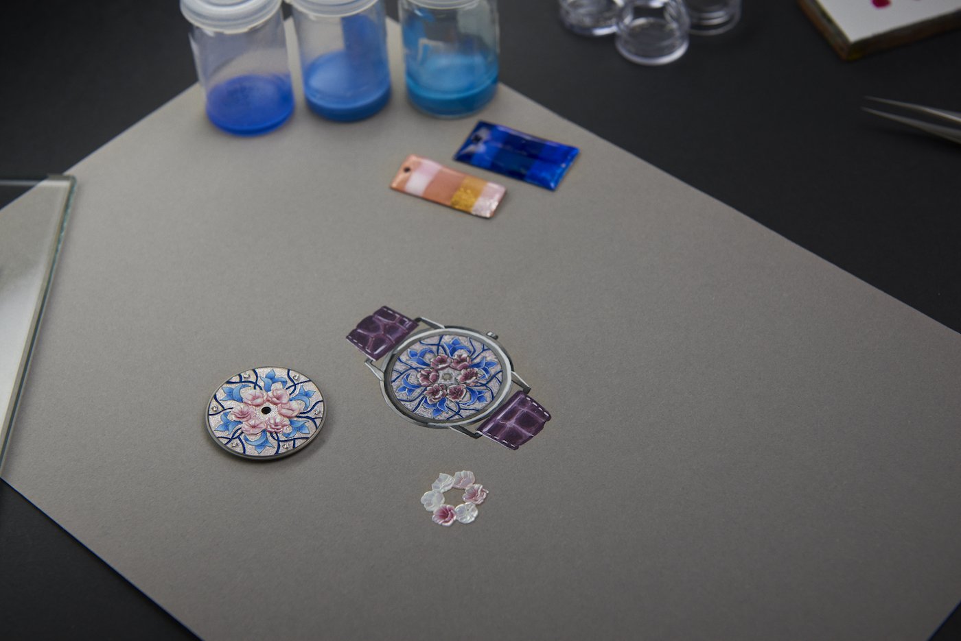 The case measures 38mm in diameter. “We imagined it, with the designer, as a frame for the dial,” says Olivier Gaud. “There are versions with diamond-set lugs and bezel and versions without diamonds.” Every part of the watch is crafted in Switzerland. “The cases are machined in Geneva by Manufacture Horlogère Genevoise (MHG); the gem-setting is by Diatheke SA; the movements are from Télôs Watch in La Chaux-de-Fonds; the hands are by Waeber HMS in Fleurier and the cases are finished by Picube. As for the straps, they’re made by Peaulux, 300 metres down the road.” All the métiers d’art, whether the engraving, the grand feu enamel or the paillons, and all the sub-techniques are the work of Atelier Olivier Vaucher.