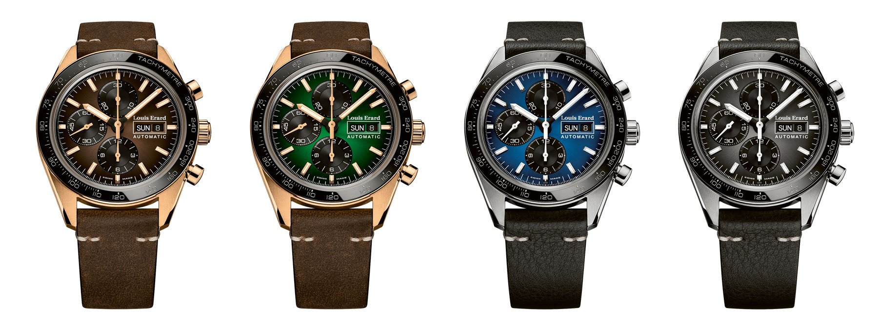For the new La Sportive collection, Louis Erard is placing the emphasis on materials. Thus, these four inaugural chronographs come in two case versions: bronze, with brown/black or green/black gradient dial, or grade 5 titanium with grey/black or blue/black gradient dial.