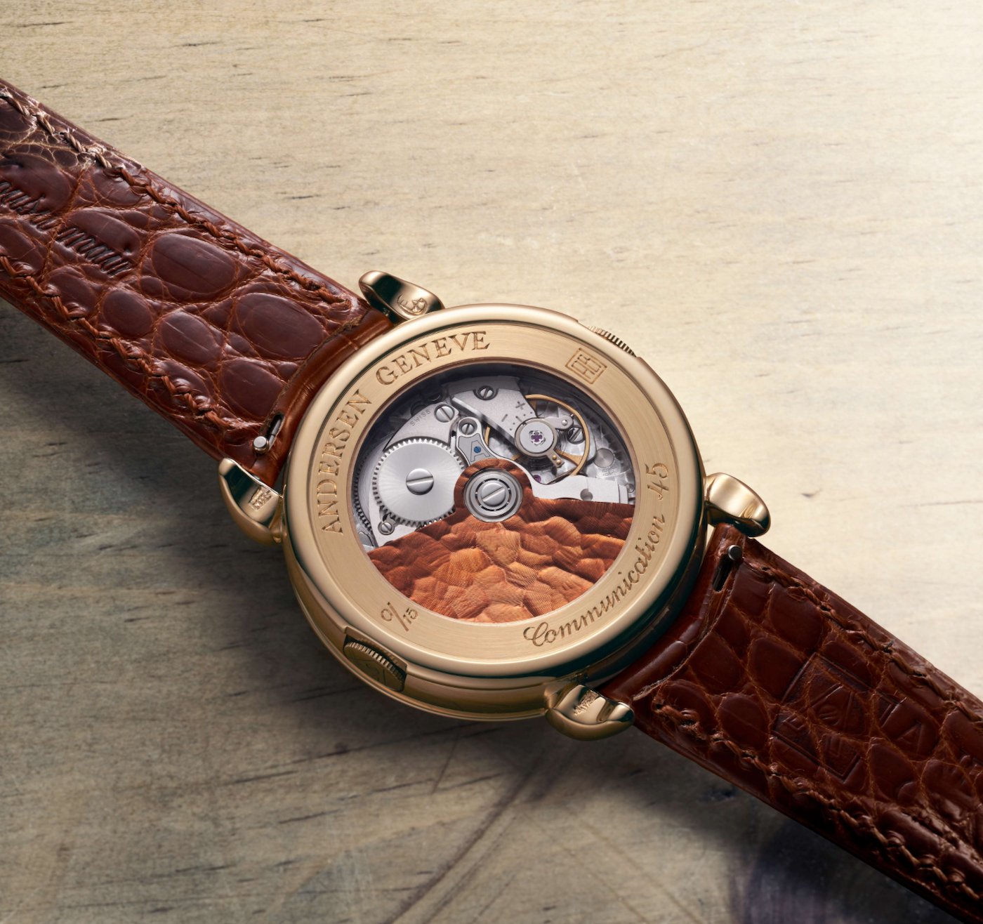 - Andersen Genève marks its 45th anniversary with the Communication 45, a limited edition that celebrates the worldtimer’s importance for the brand (top, shown next to the original from 1990). Since its creation, the worldtime module has been constantly refined and now measures just 0.9mm thick. Like the dial, the oscillating weight is 21k BlueGold in a cognac shade. The contrast with the frosted texture of the bridges and plates highlights the chamfering.