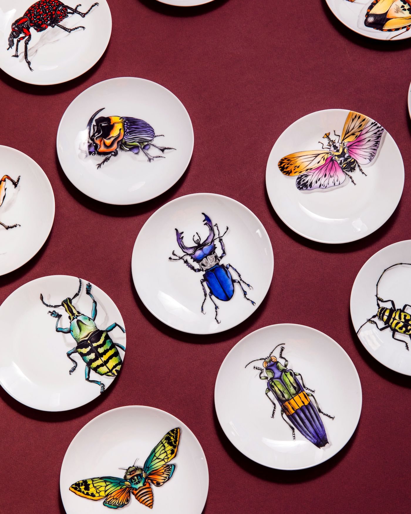 You don’t want to have dinner with people who don’t have a sense of humour! In the end, everyone finds it very funny because no one is singled out: everyone gets to the same treatment. But you have to end on a good note, so for dessert I chose sweet words: love, goddess, darling, muse... As for the dinner service with beetles, they are inspired by my jewellery. I love the magic of these creatures that appear almost prehistoric. In ancient Egypt they were a symbol of longevity. Sometimes people have a phobia of beetles, so I’ve included some spiders (laughs).