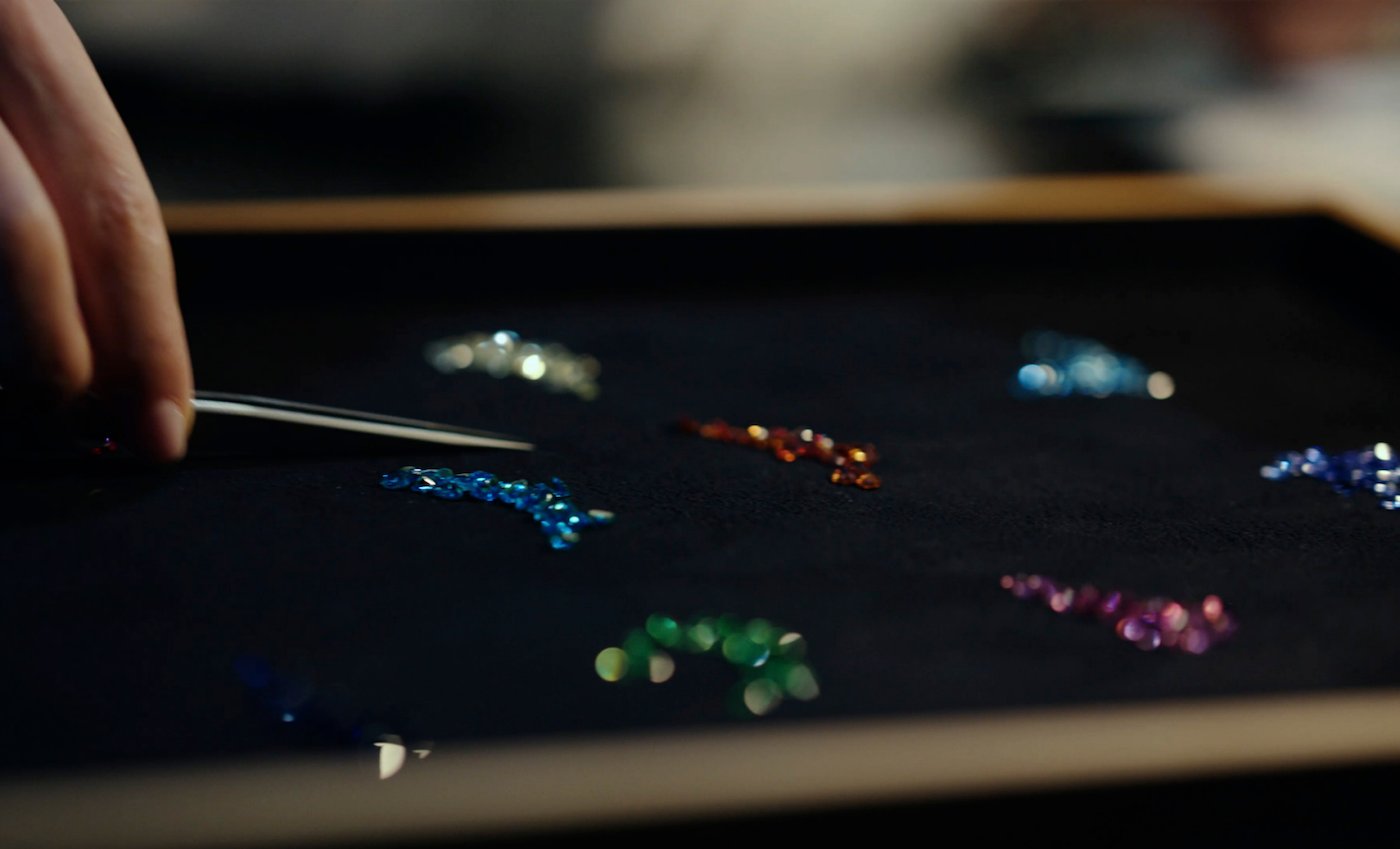 “We start by defining the criteria for each stone,” the gemmologist explains. “We compare different colours side by side until we’ve identified the best set. After this, our partners travel to countries around the globe and purchase several batches of stones. The majority are pre-shaped or semi-cut, as this gives excellent colour rendition. Our partners then have them cut to our exact specifications, following which we take delivery. The invisible setting is such a complex technique that it can take up to eight hours to cut each stone.”