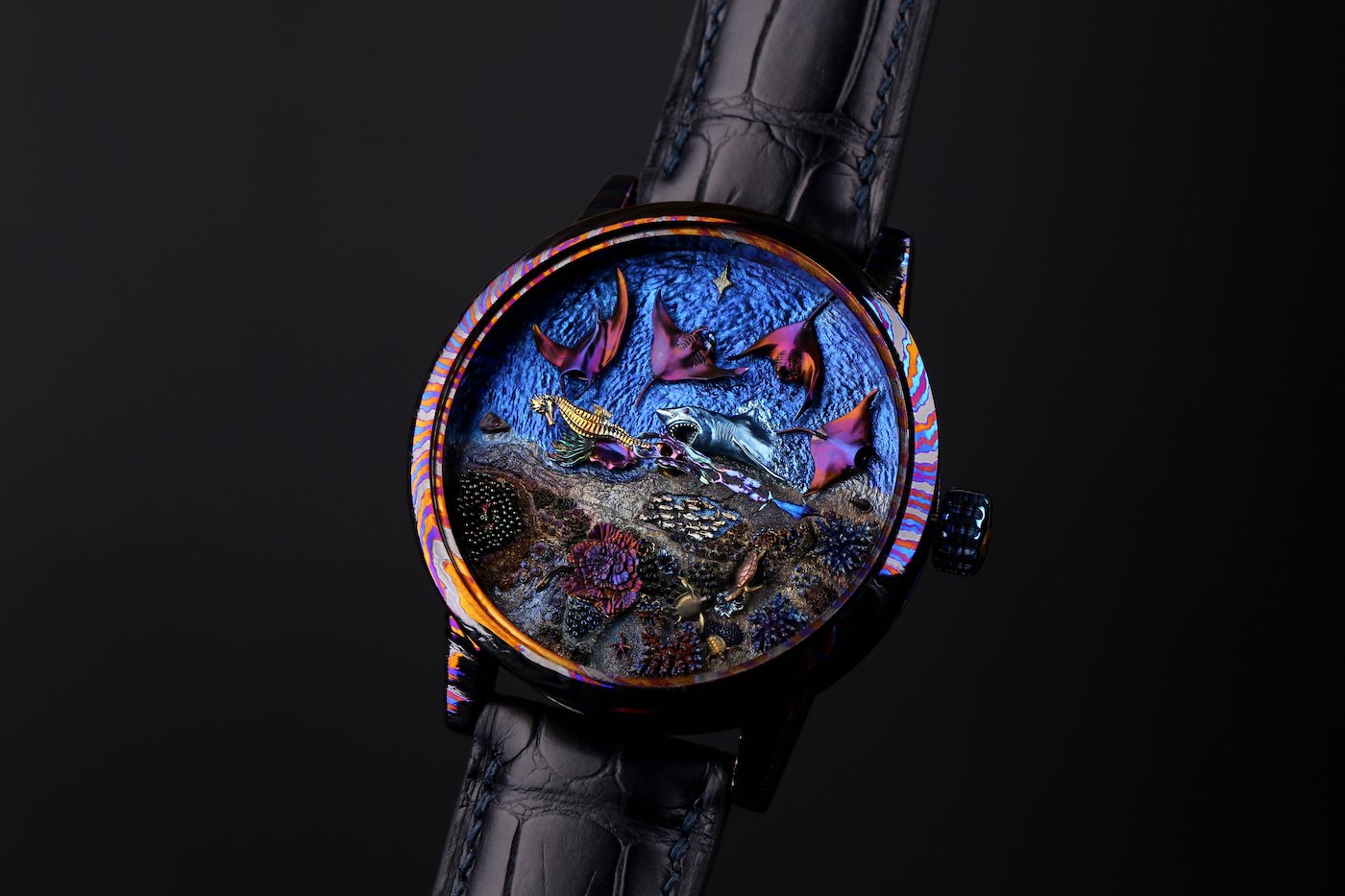 Wallis Hong for example. Recognisable by his slender silhouette, delicate manner and the precious butterfly alighted on his white jacket, the 27-year-old Chinese-born, Madrid-based jewellery artist transposes the fantasy worlds of his imagination into sculpted titanium jewels or onto watch dials still waiting for the movement that will bring them to life.