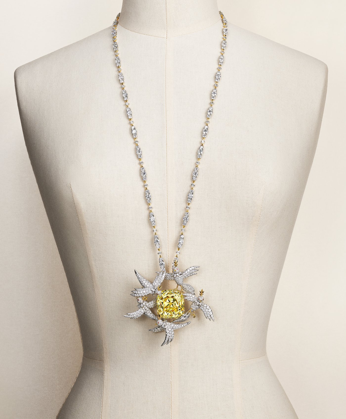 “Rather than a single bird resting on top of the diamond, our designers reimagined the motif to evoke five birds encircling the diamond in midair,” explains Victoria Wirth Reynolds. This new interpretation can be worn as a brooch or as a pendant, thanks to a clasp on the back. And who knows, perhaps the fifth person to wear the Tiffany Diamond will be… a man?