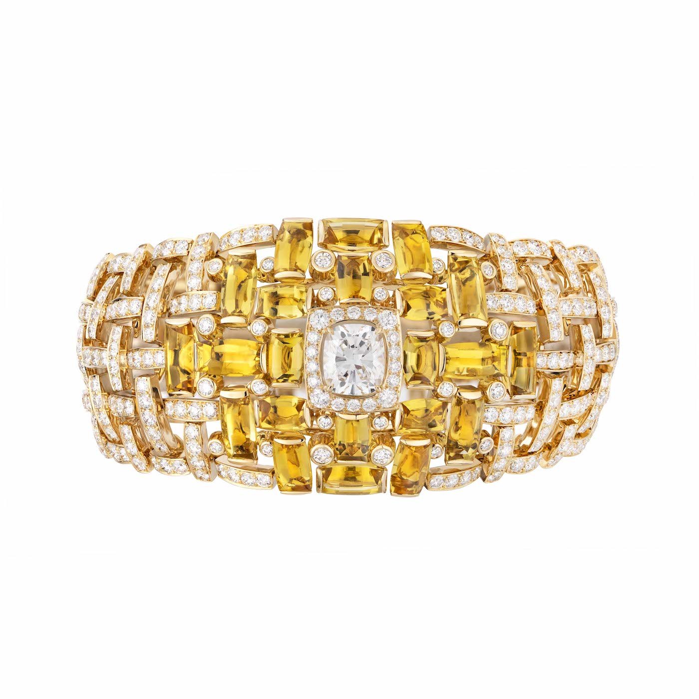 The most remarkable aspect of the collection is the way in which Chanel’s jewellers have recreated the fabric’s warp and weft. Tweed’s supple texture and multiple patterns are rendered through intricate weavings of gold and platinum threads and through deft openwork. The centrepiece of the collection, the Tweed Royal necklace looks for all the world like a piece of tweed; a precious trompe l’oeil of yellow gold links, set with diamonds and rubies then finished with a gold chain.