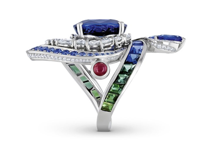 On this Haute Joaillerie creation by Maison Gübelin, the stunning sapphire sparkles at the centre of a sculptural ring, surrounded by a large coterie of sapphires, tourmalines and diamonds in a sophisticated mix of cuts. In homage to the aquatic colours of the Indian Ocean and the tropical vegetation that lines the dazzling white sands, the designers chose sapphires in graduated shades of blue, tourmalines in a captivating range of colours from green to blue, and sparkling diamonds.
