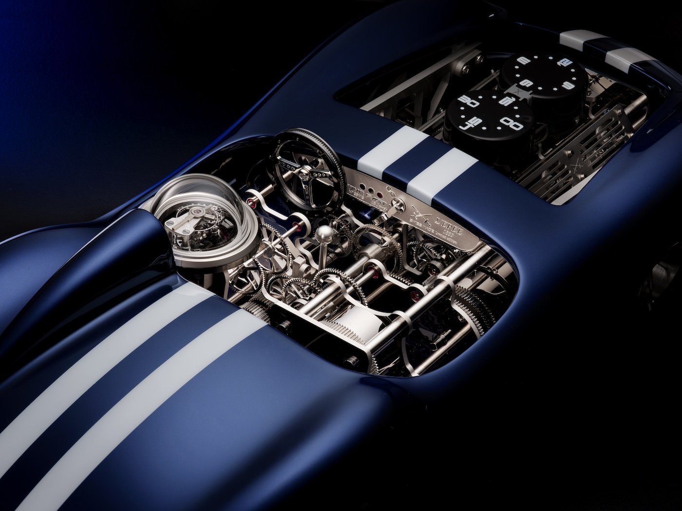 The Time Fast II in Chrome celebrates the iconic lines of 1960s race cars. The time displays (hours and minutes) of the eight-day manufacture movement are on the dual air filters feeding the V8’s two banks of carburettors.