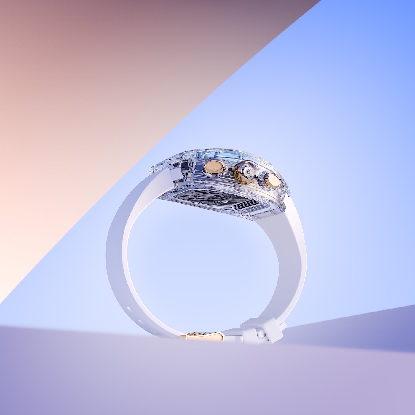 - Pushers and gear switch: rose gold (18K); polished, microblasted