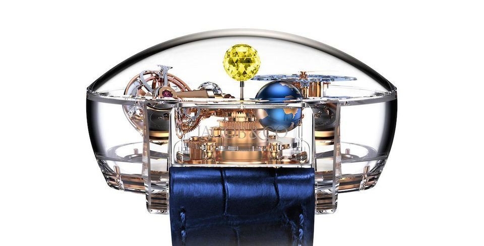 An exclusive 1-carat Jacob Cut® diamond performs one complete rotation every 30 seconds, around an axis connecting it to a blue-lacquered magnesium globe; flanking these is a triple-axis tourbillon, the cages of which orbit in 60 seconds and 2.5 minutes respectively.