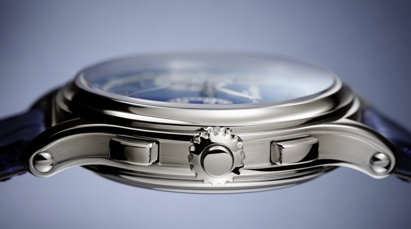 The two-phase chronograph movement with two pushers for the chronograph functions and a rattrapante pusher integrated in the crown at 3 o’clock is an impressive example of how tradition meets innovation. The classic elements of the basic architecture are the manual winder, dual-column-wheel control, and the horizontal wheel clutch. Nonetheless, it is a 21st-century movement endowed with extensive optimization details and patented innovations as well as an advanced rattrapante mechanism.