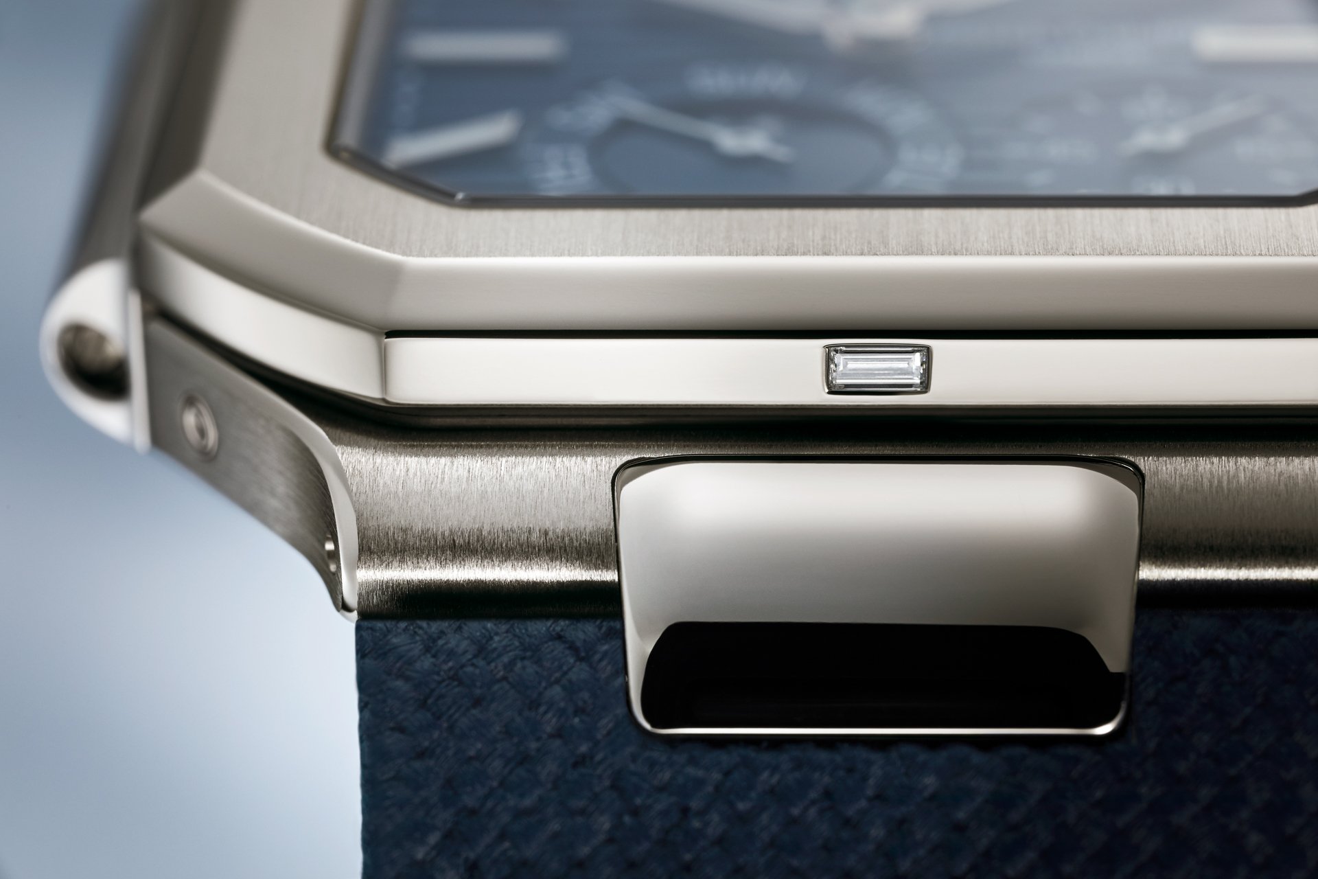 The modern, casual chic style with a technical edge continues through to a navy-blue strap with cream contrasting stitching in an ultra-resistant composite material embossed with a fabric motif, and a Cubitus fold-over clasp in platinum.