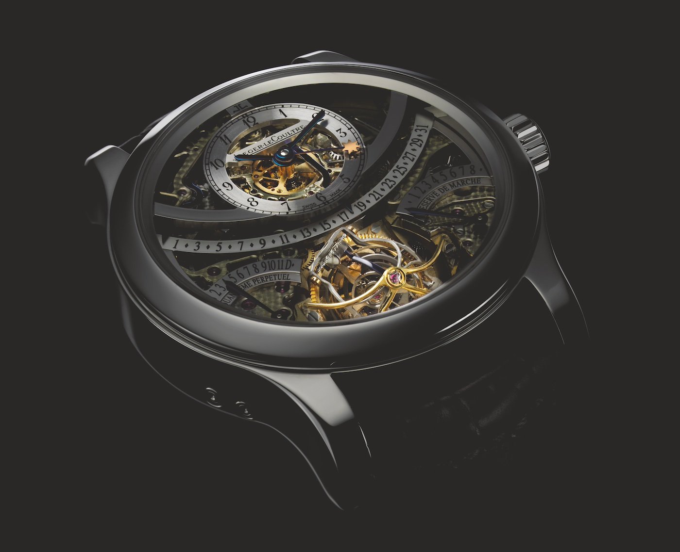For the Gyrotourbillon, Eric Coudray not only developed a spherical tourbillon for a wristwatch; he “positioned the balance wheel perpendicular to the tourbillon cage.” Another first.