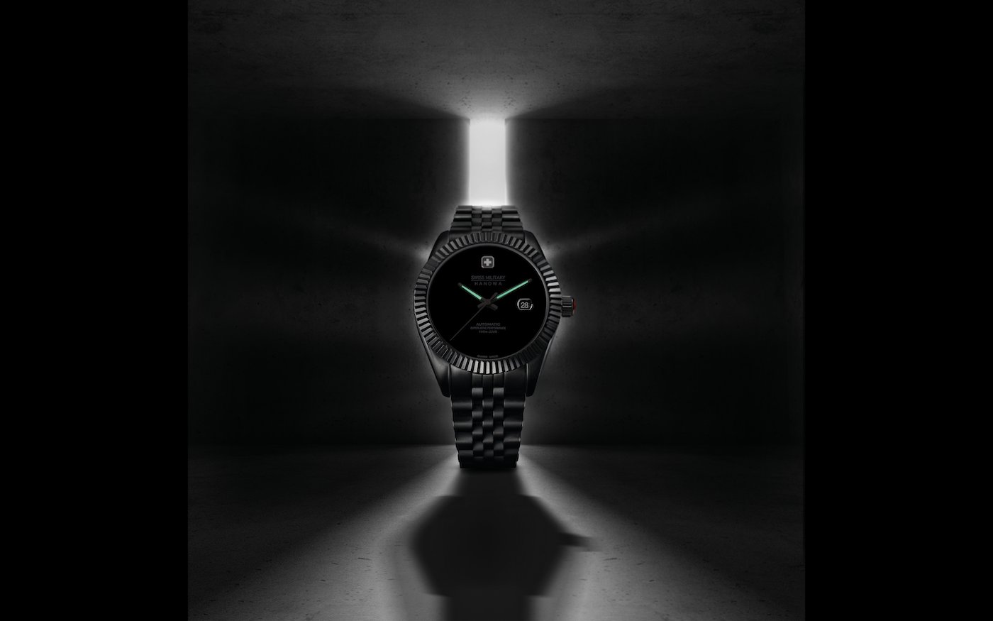 Particularly noteworthy – and a bestseller for Swiss Military Hanowa – is a stealth model whose dial is coated with Musou Black, which absorbs 99.4% of light. Both the case and the bracelet are in black stainless steel. It’s a powerful concept, retailing at CHF 329 for the 42mm Dark Matter, equipped with a Ronda quartz movement, and CHF 749 for the Dark Night version, driven by a Soprod P024 automatic three-hands and date movement, with a matte fluted bezel on a 41mm case.