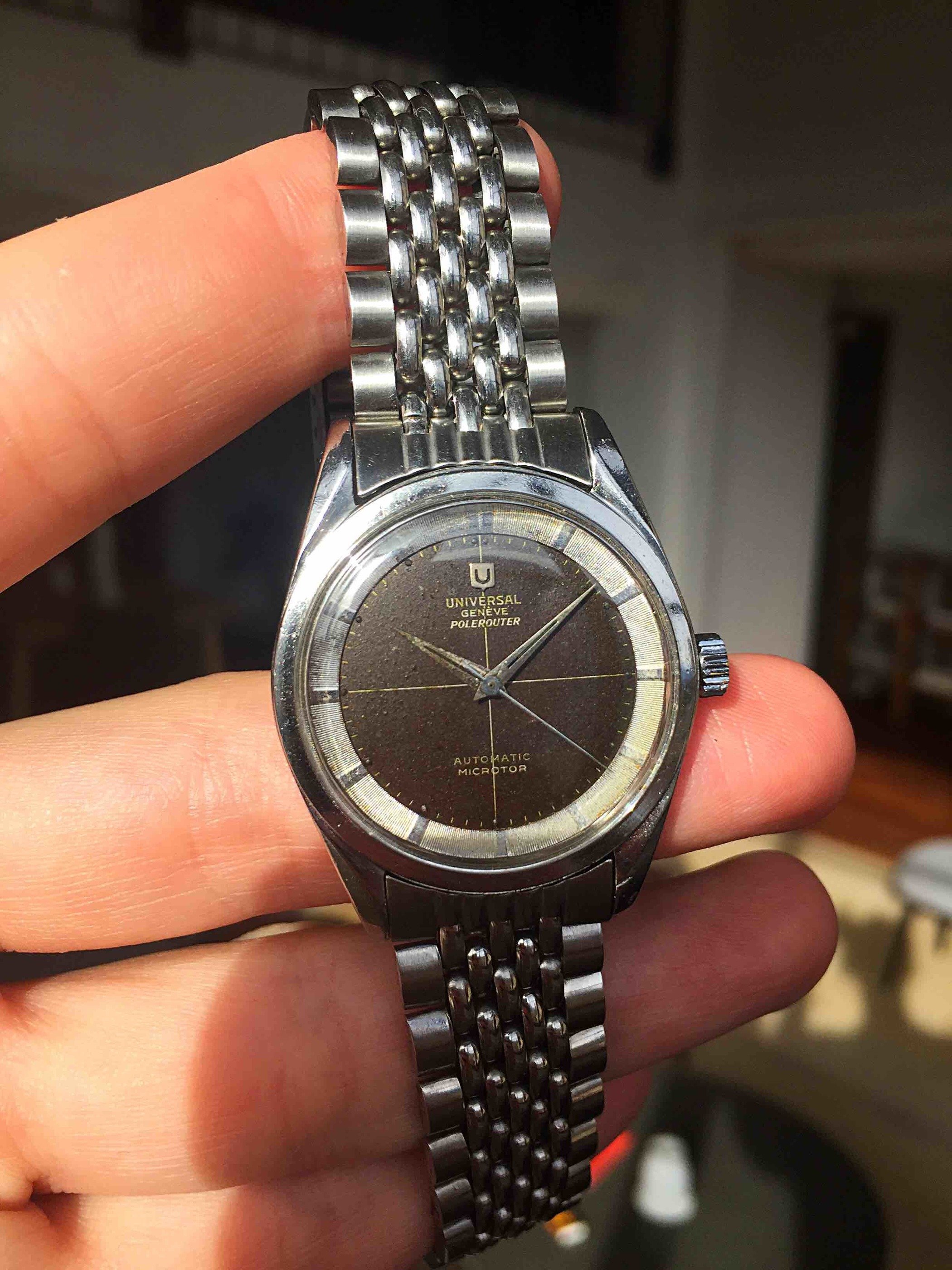 In the 50’s, Universal Genève was a direct rival to Rolex and their watches were as expensive as the sport models of the famous company founded by Hans Wilsdorf. At that period in time, an 18K gold case Polerouter with its gold bracelet was close to the price of a VW Beetle.