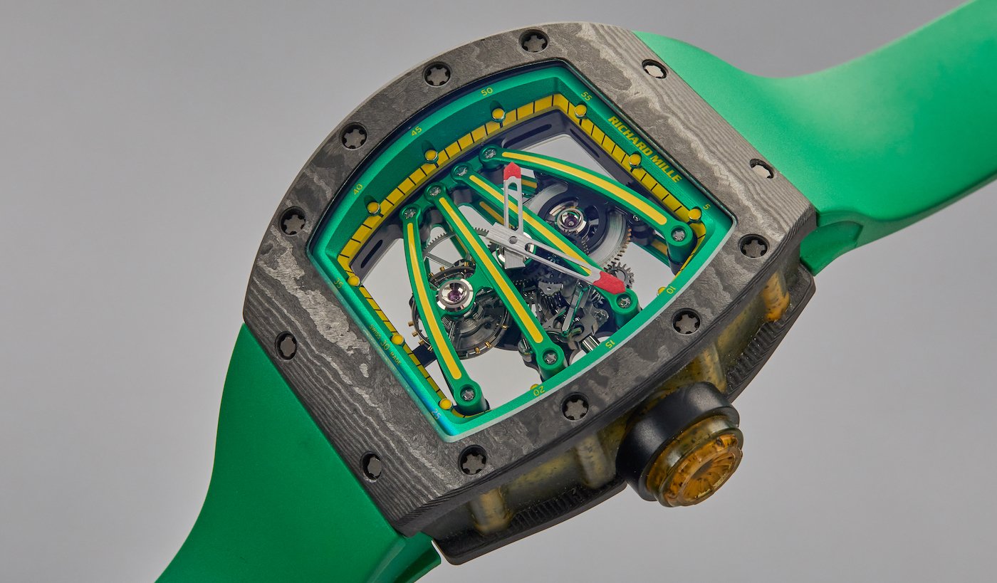 6. Richard Mille Ref. RM 59-01: A rare and attractive limited edition translucent skeletonized tourbillon 48 tonneau-shaped wristwatch with presentation box, numbered 11 of 50, accompanied by a hand-written note from Sylvester Stallone. $816,500