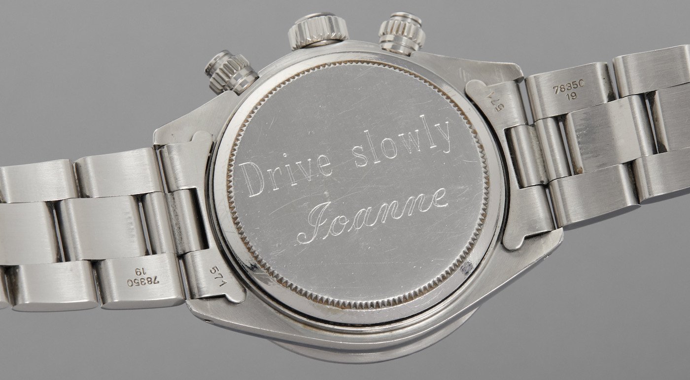 1. Rolex Ref. 6263: An iconic, historically important, and attractive stainless steel chronograph wristwatch with 38 black dial, caseback engraving, and bracelet, given to Paul Newman by Joanne Woodward and later gifted to their daughter, Clea Newman. $5,475,000