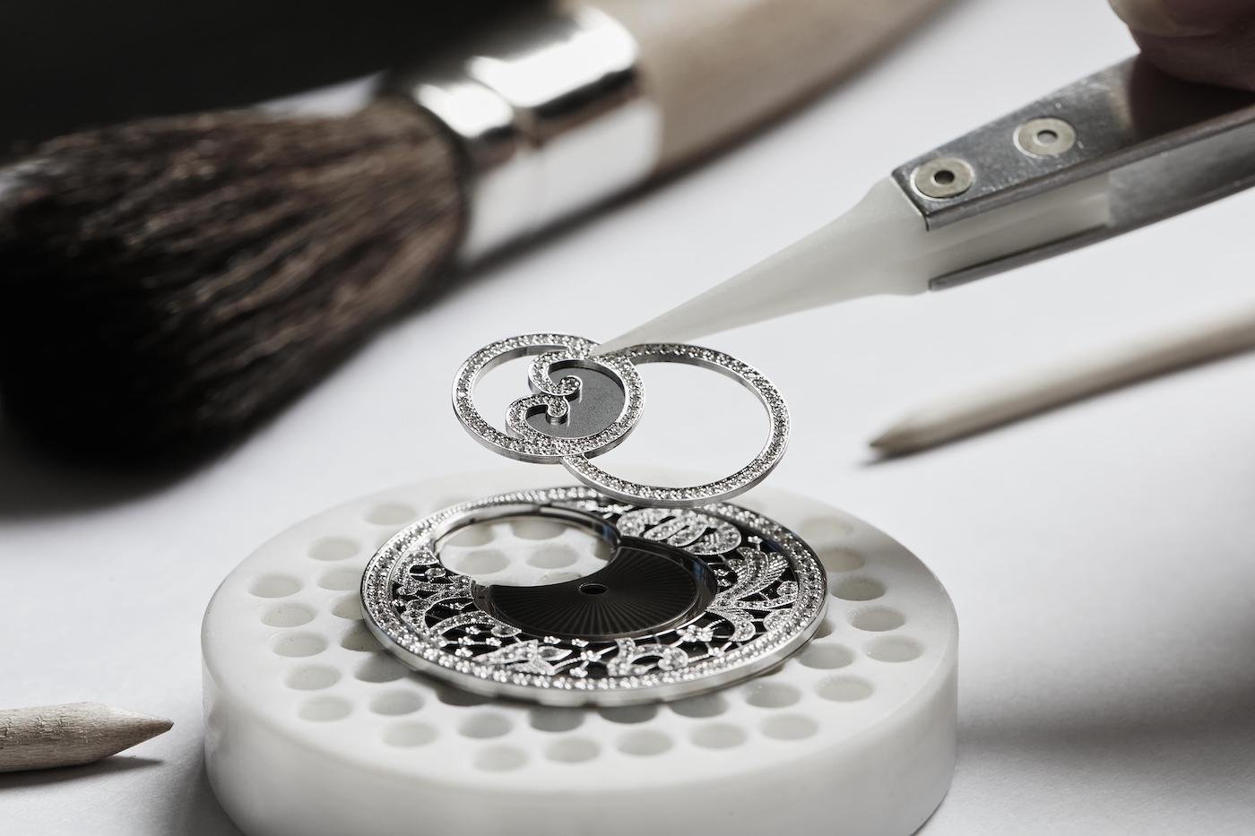 This new watch, which is fitted with an in-house automatic mechanical movement, calls upon multiple crafts. They are watchmaking, engraving, tapisserie, gem-setting and enamelling. Tapisserie, a technique similar to guillochage, takes the form of a pleated design on a silver base. Enamelling is represented by the plique-à-jour enamel which partially covers the moon-phase display. In this painstaking technique, the enamel is applied inside a cell with no backing so that, after firing, light can pass through it, not unlike a stained-glass window. The engraver’s art is expressed in a white gold lace that is barely thicker than an eyelash. Lastly, the translucent black enamelled dial sparkles with 250 brilliant-cut diamonds. A further 292 diamonds are set in the case and crown.