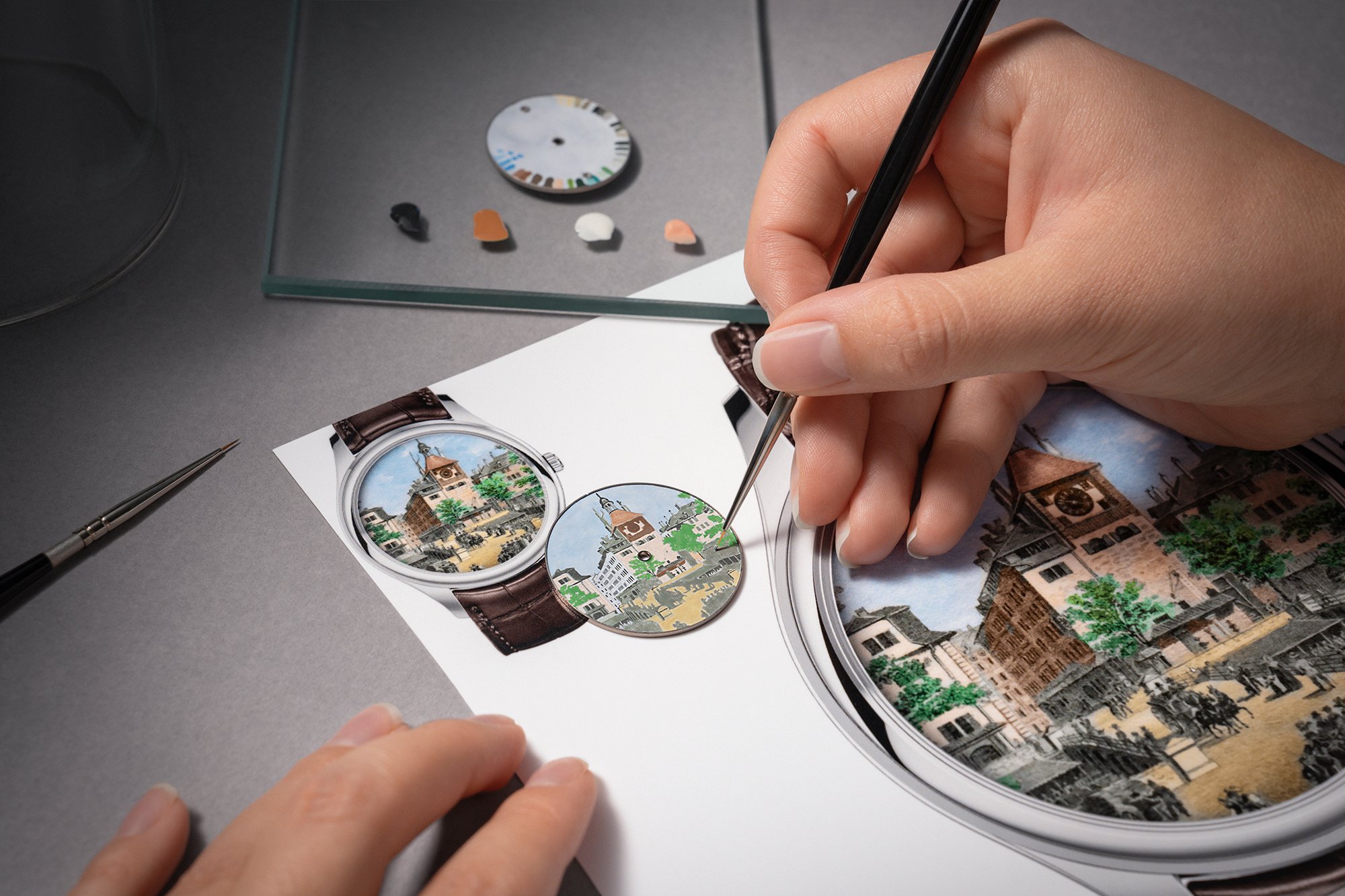 The Manufacture’s Les Cabinotiers workshop has created three single-piece edition timepieces that pay homage to the Tour de l’Île. Set in a refined 40mm case, each depicts a view of the tower inspired by an historic lithograph. Miniaturised for a 33.6mm-diameter dial, yet faithful to every detail of the original image, these meticulously hand-crafted dials showcase several métiers d’art, including Grand Feu enamel and guilloché.