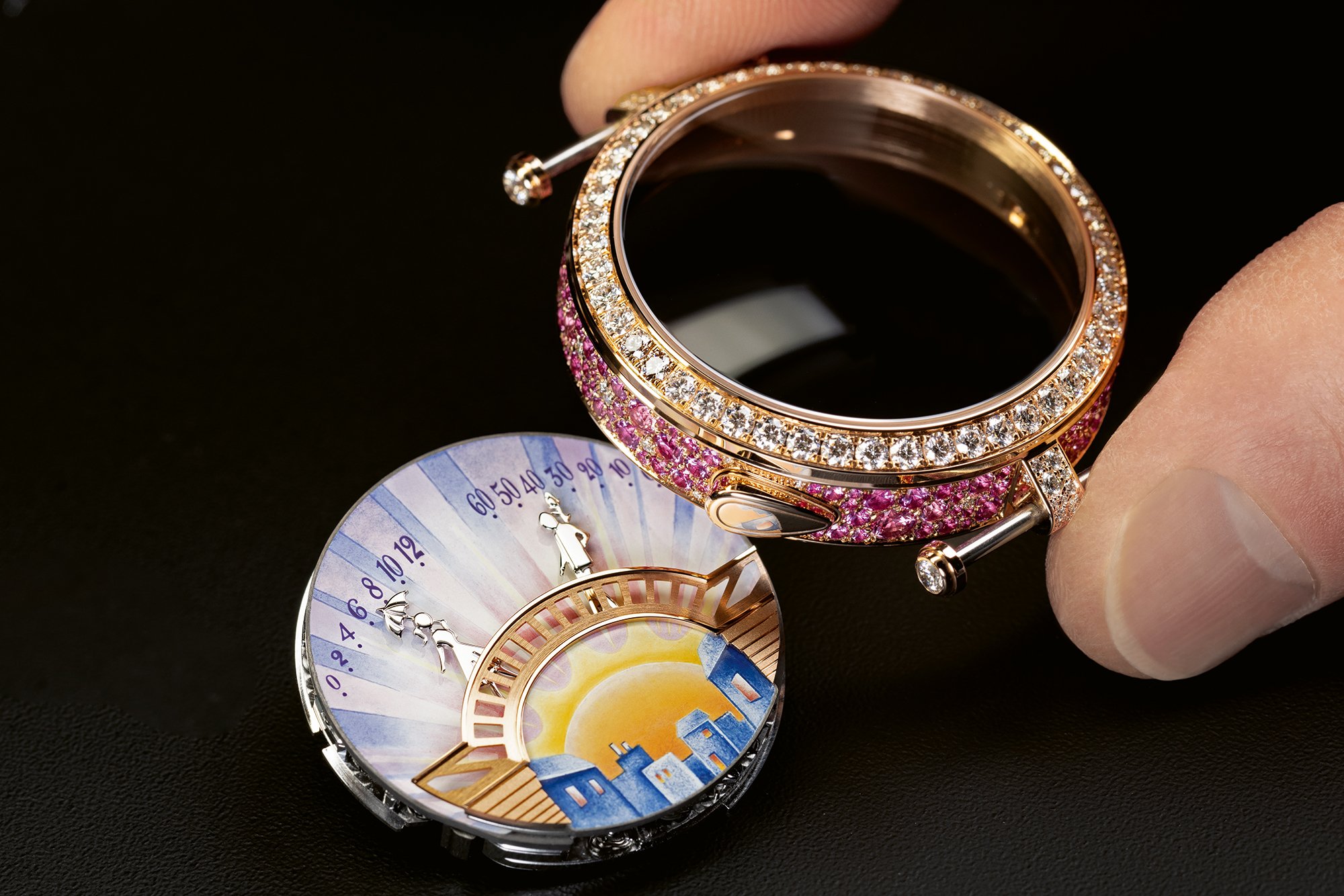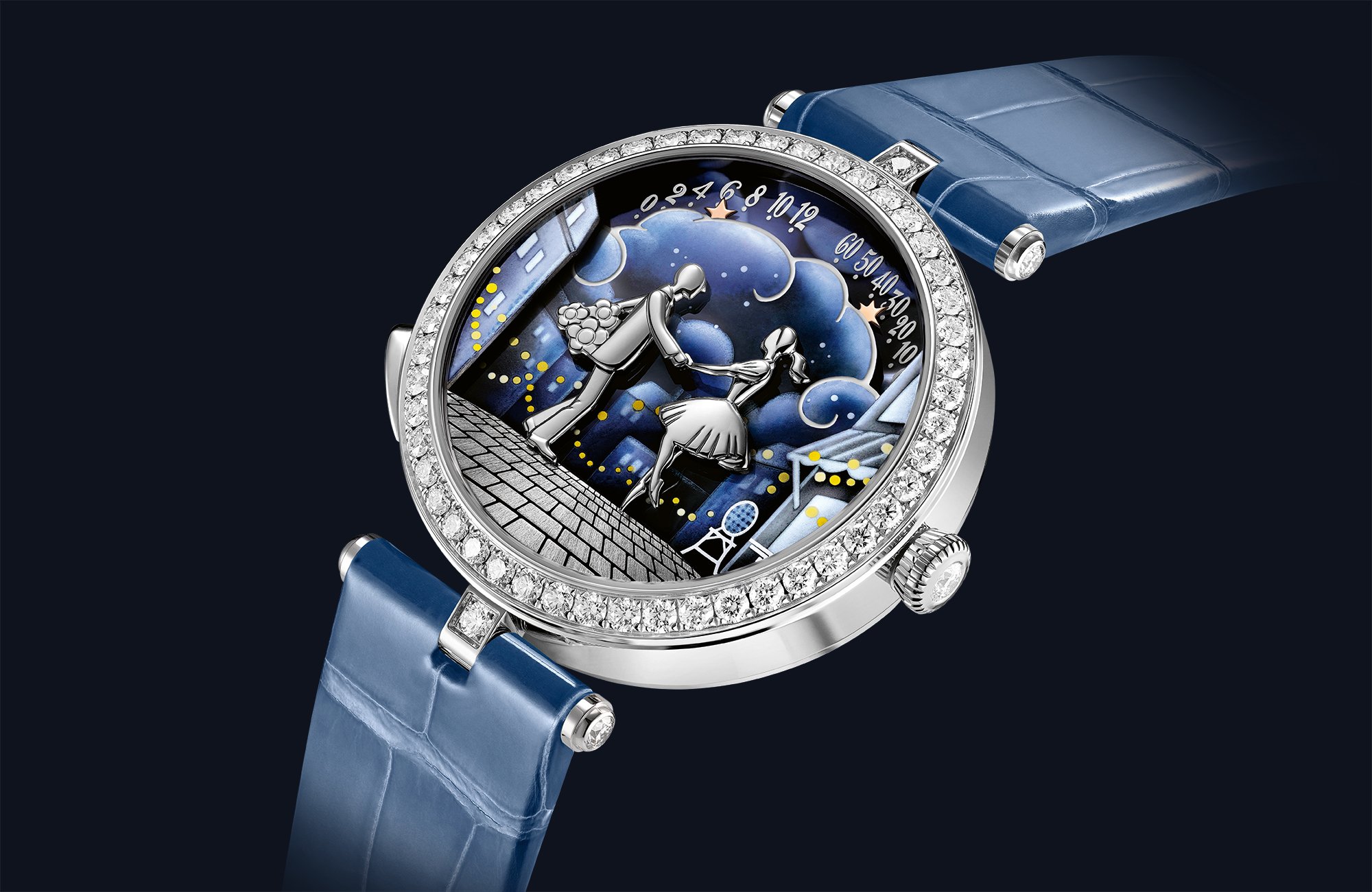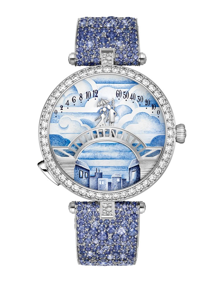 oetry, poetry and yet more poetry: with its new creations for 2025, Van Cleef & Arpels once again confirms and reinforces its territory – against a backdrop of Paris, with new variants for the Pont des Amoureux collection in dawn, morning, evening or moonlight hues thanks to the technique of coloured grisaille enamel, and the Bal des Amoureux Automate watch, an equally romantic automaton conveying the atmosphere and charm of a guinguette: at midday and midnight, the figures approach one another and exchange a kiss.