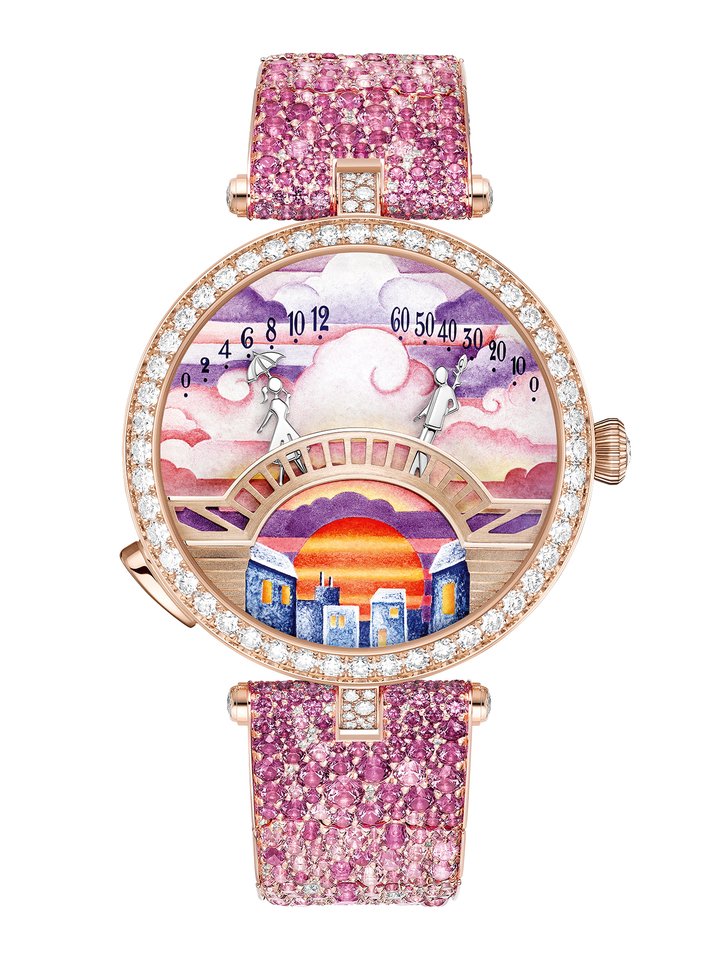 - This year, four new watches with precious bracelets enrich the Lady Arpels Pont des Amoureux story, revealing the couple in landscape scenes evoking different moments of the day. In turn, the dials take on colour nuances of dawn, morning, dusk and moonlight.
