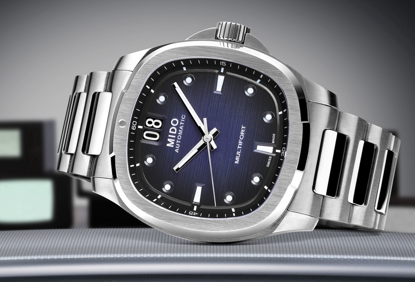 The Multifort TV Big Date launches with four other models: two in steel with a green gradient or black gradient dial, and two on rubber straps in navy blue or Mido’s distinctive orange.