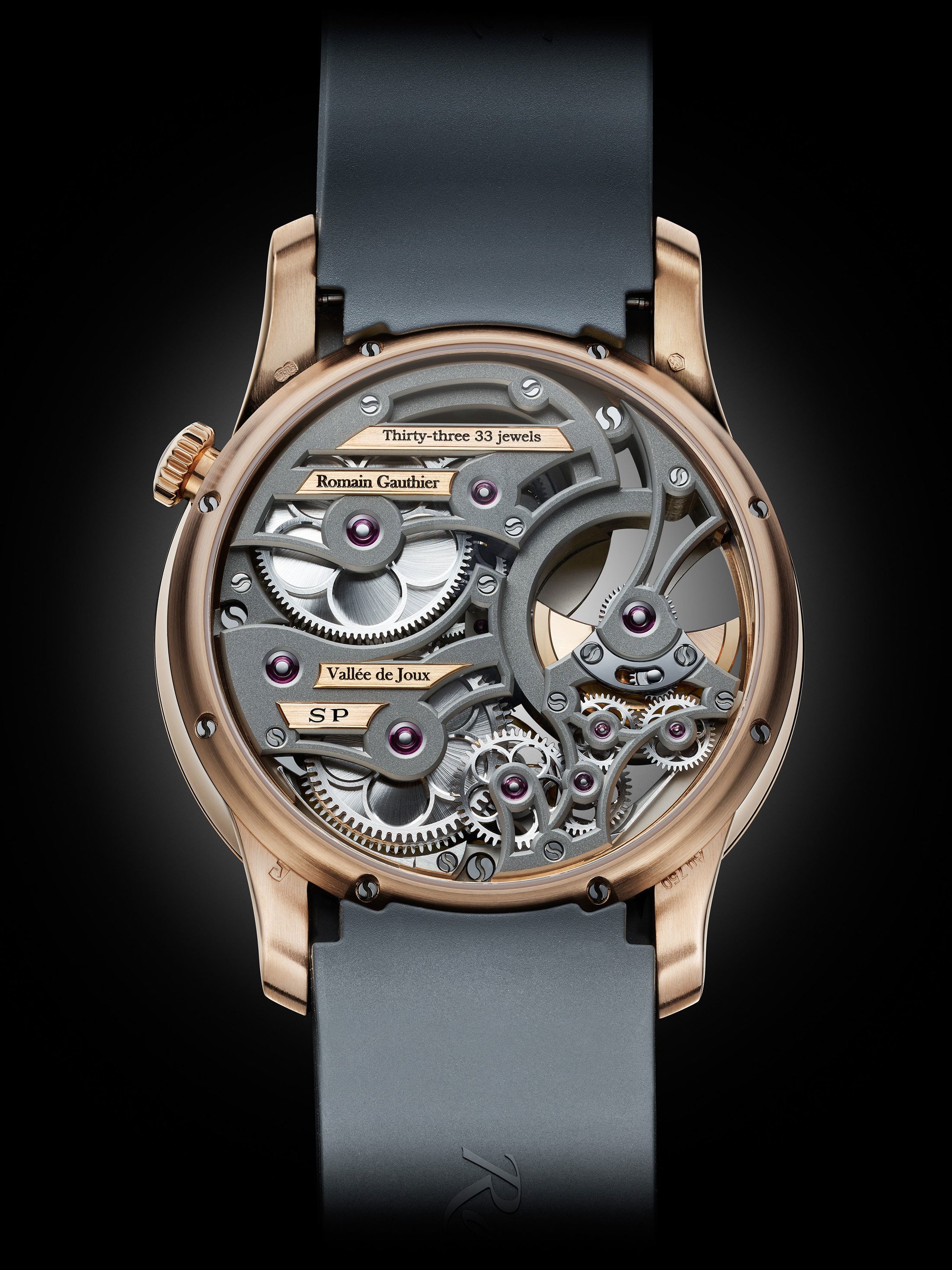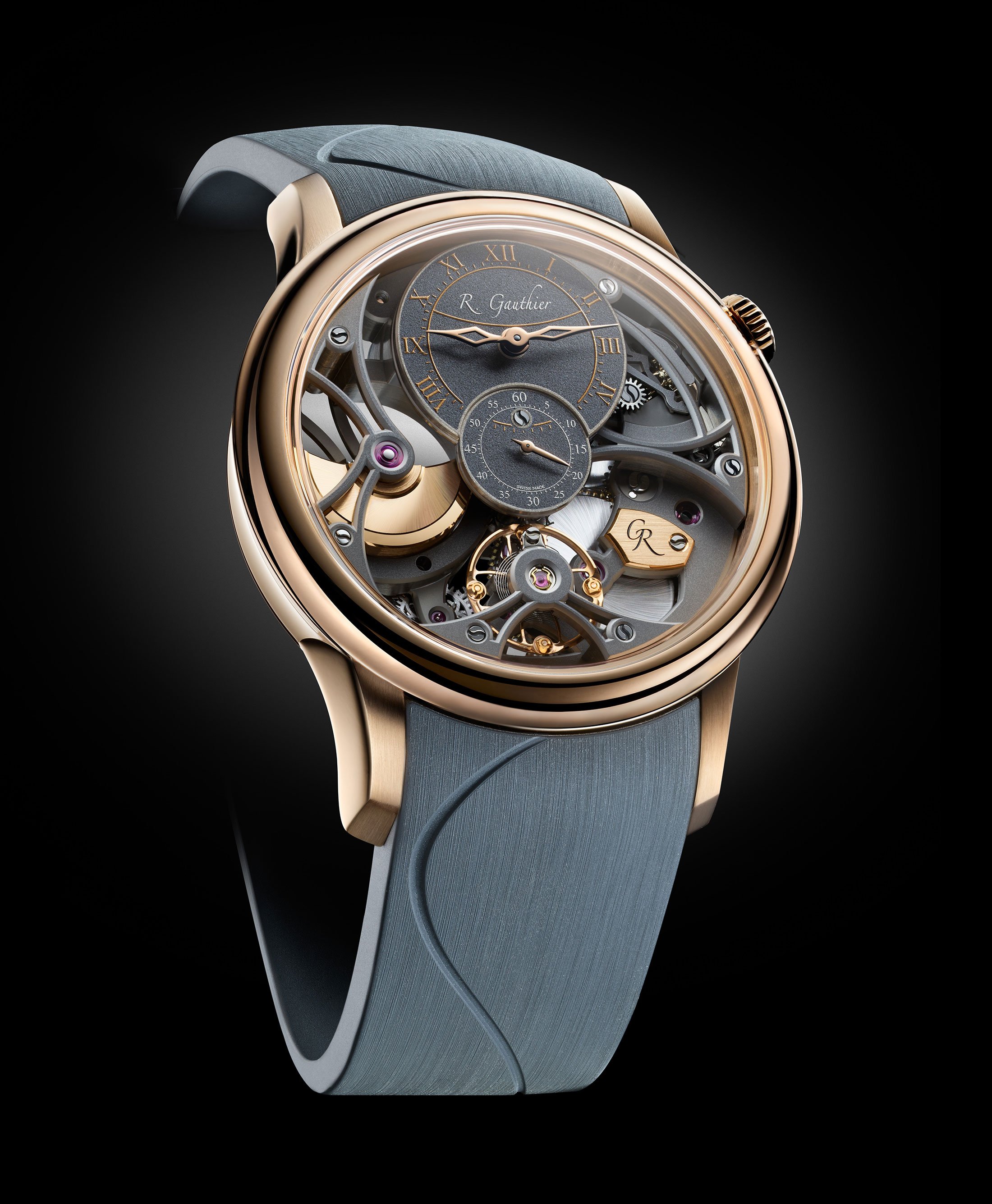 The skeletonised movement is the Micro-Rotor, the prestigious automatic movement from Romain Gauthier with a micro-rotor carved out of 22-carat gold, which winds a double mainspring barrel providing a power reserve of 80 hours.