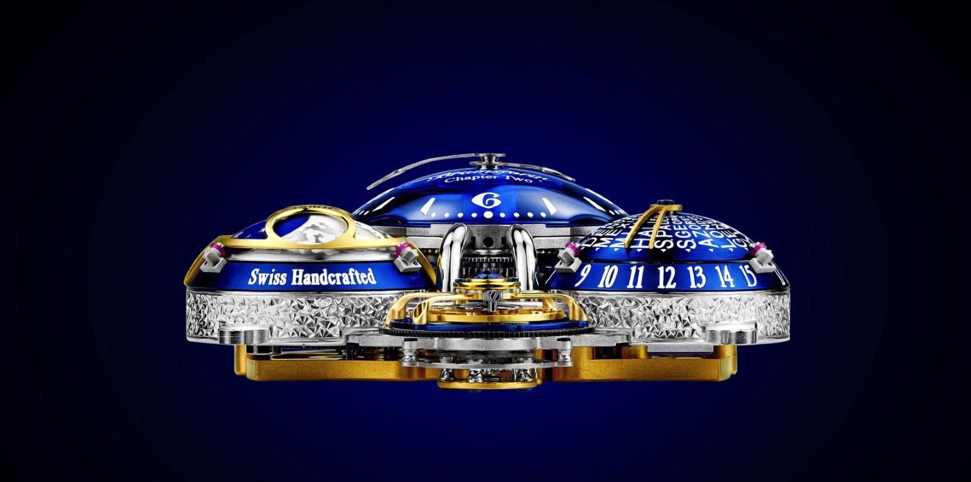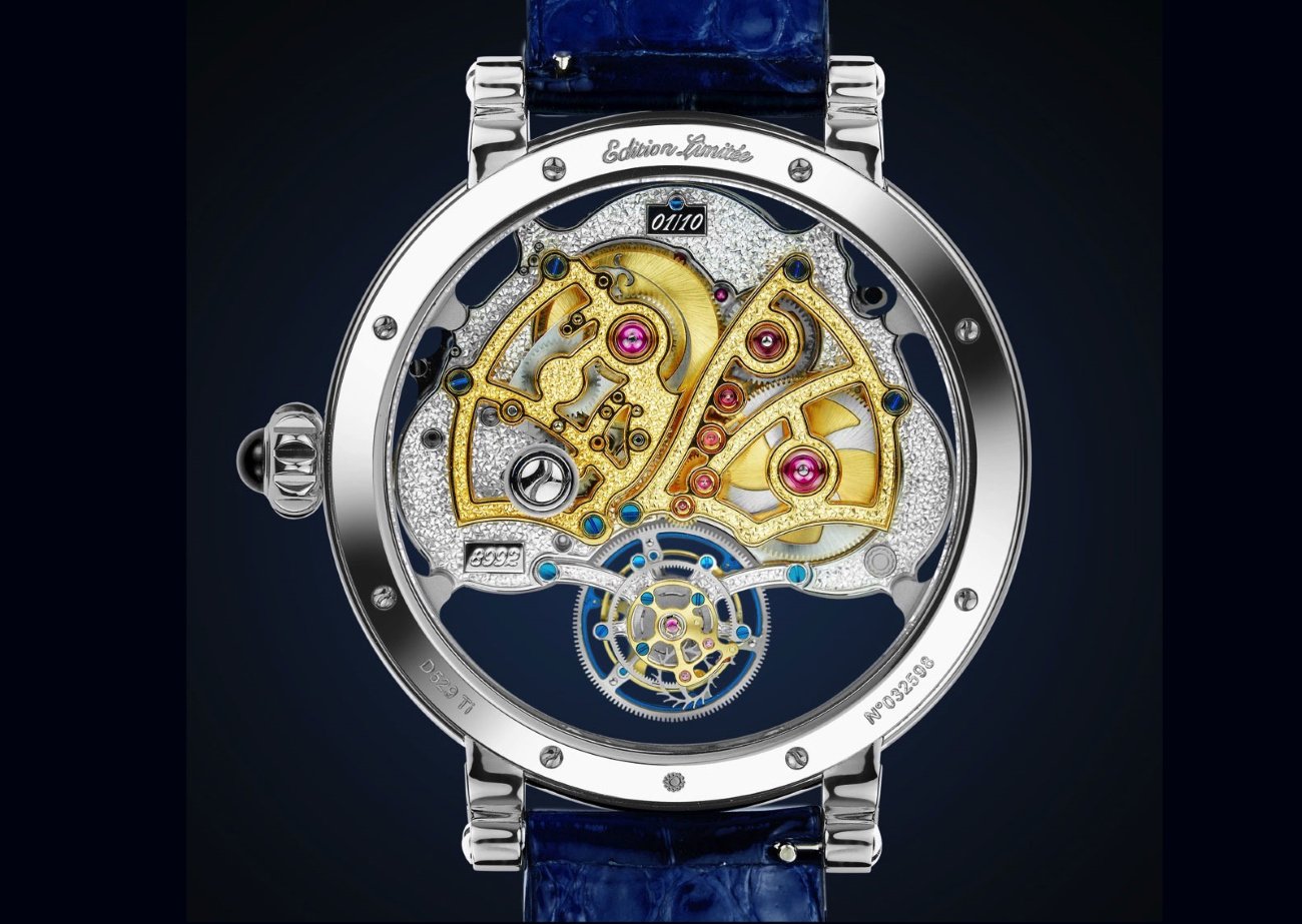 - Limited Edition of 10, sapphire “Writing Slope” case with blue quartz dial, patented double face flying tourbillon, patented radial guidance system, patented universal time display, three-dimensional moon phase, five days’ power reserve. Limited edition of 60 fully hand-engraved movements.