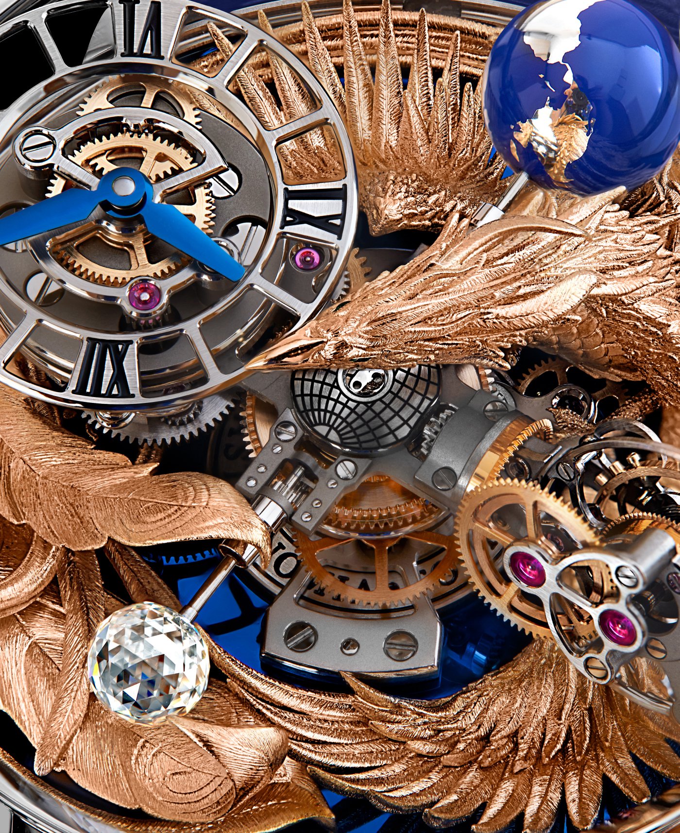 At the centre of the piece, four arms supporting four satellites are deployed, mounted on an axis. The first satellite is a tourbillon revolving on two axes, one in 60 seconds and the other in five minutes; the second is a “Jacob-cut” diamond with 288 facets, rotating in 60 seconds; the third, aligned with the tourbillon, shows the hours and minutes; the fourth is a globe in lacquered magnesium, which performs a 60-second revolution.