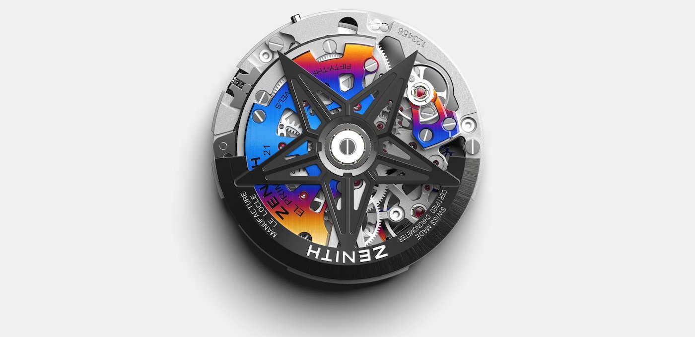 - The Defy 21 Felipe Pantone is the result of a collaboration between Zenith and the Argentinian-Spanish artist Felipe Pantone. This strikingly colourful creation plays with frequencies – both visually and mechanically – with its 1/100th of a second El Primero 21 chronograph movement beating at an extremely high frequency of 360,000 vibrations per hour, as well as with its rainbow-coloured coating on the bridges, central hands and parts of the dial. The limited edition of 100 is the first model to use this innovative three- dimensional PVD coating. Although the process has been standardised, each piece will take on slightly different colours, becoming a unique work of art.
