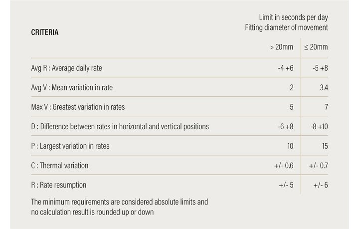 Seven criteria are measured according to the ISO 3159 standard, along with the tolerance data in seconds per day for a balance spring movement or wristwatch.