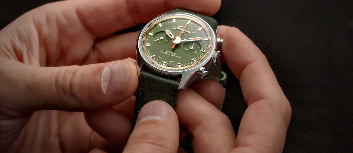 - The 1969 line consists of chronographs and timers, including these steel variations with a sun-brushed silver dial or bronze case and matt green dial.