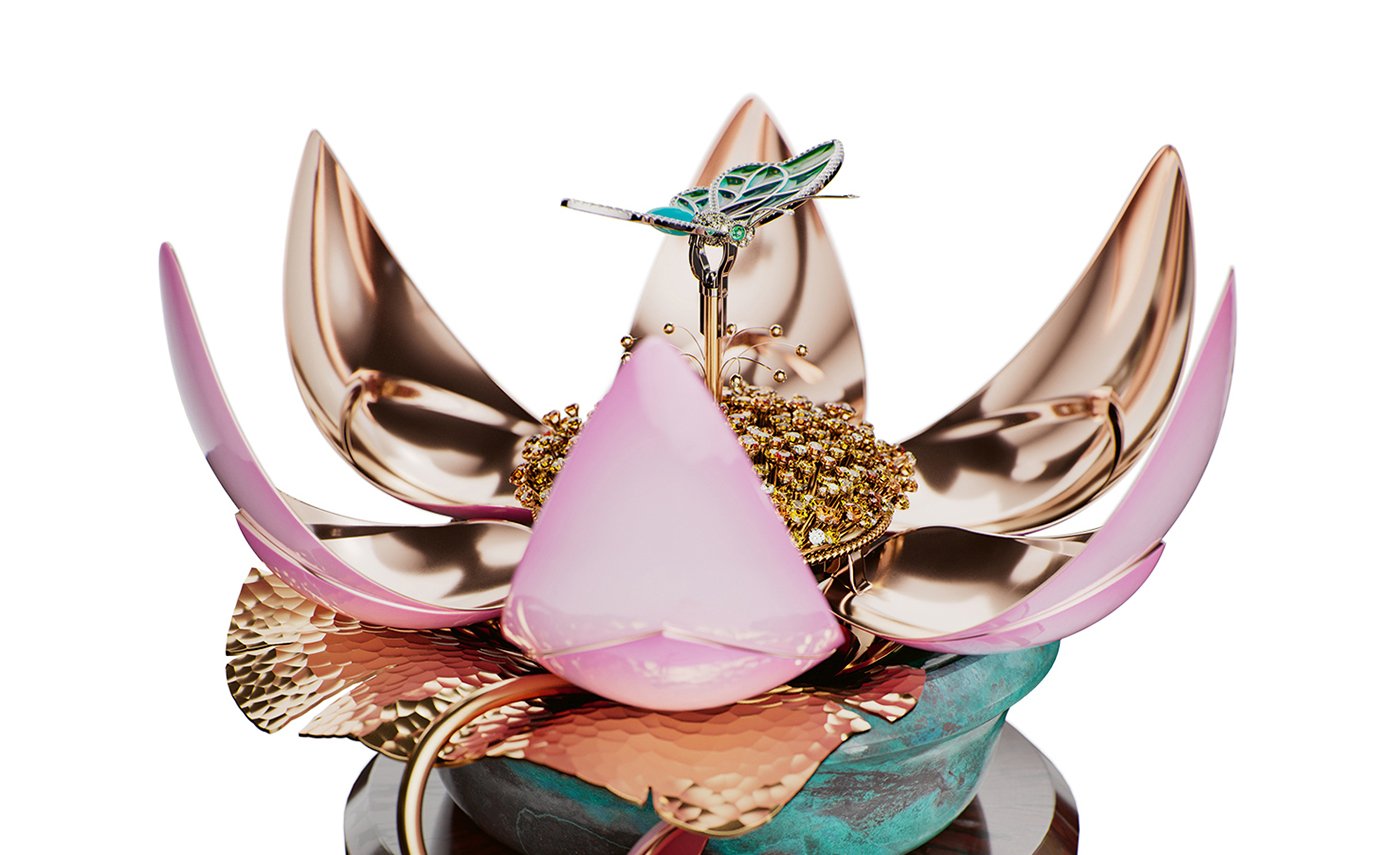 On the Van Cleef & Arpels Floraison du Nénuphar automaton, the butterfly flutters its wings of plique-à-jour enamel through which the light passes. It rises above a dome of yellow gold set with yellow sapphires in two shades, spessartite garnets and diamonds that gleam like the sun from the centre of a delicate corolla. A lily pad and stem appear, drawing the eye toward a rose gold flower bud, similarly lacquered. To complete the creation, a white gold fairy set with three shades of blue sapphires graces the base of the object, where a rotating ring displays the hours.
